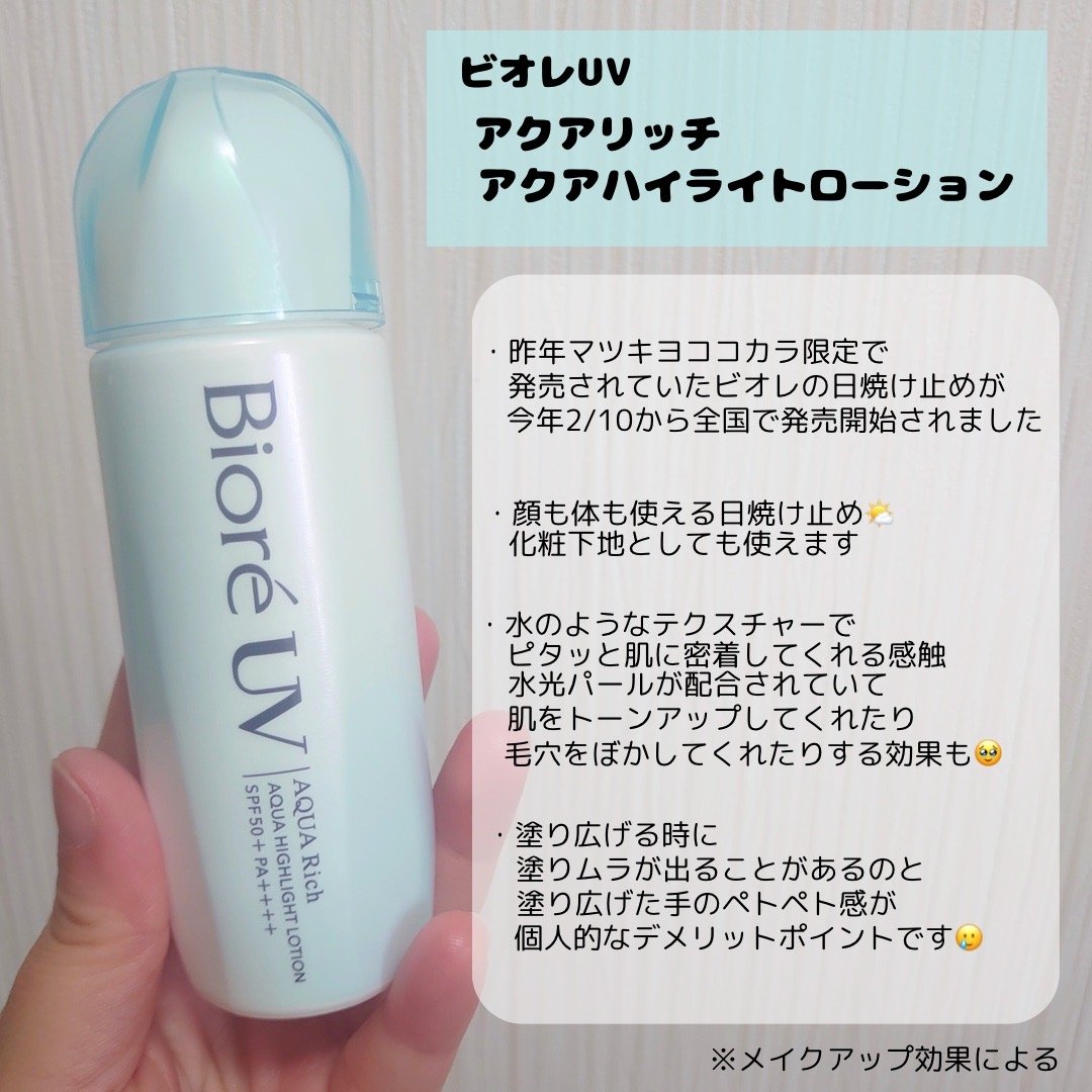 .ビオレUVアクアリッチアクアハイライトローション🌸#水層ハイライトuv身体用に購入🙌シャバシャバ系の日焼け止め。ジェルタイプに慣れてた私としてはやや使いづらい笑でも微粒のパールがすごくて、ほんとにキラキラつや感がアップ。頰、鼻筋やひたいに使...