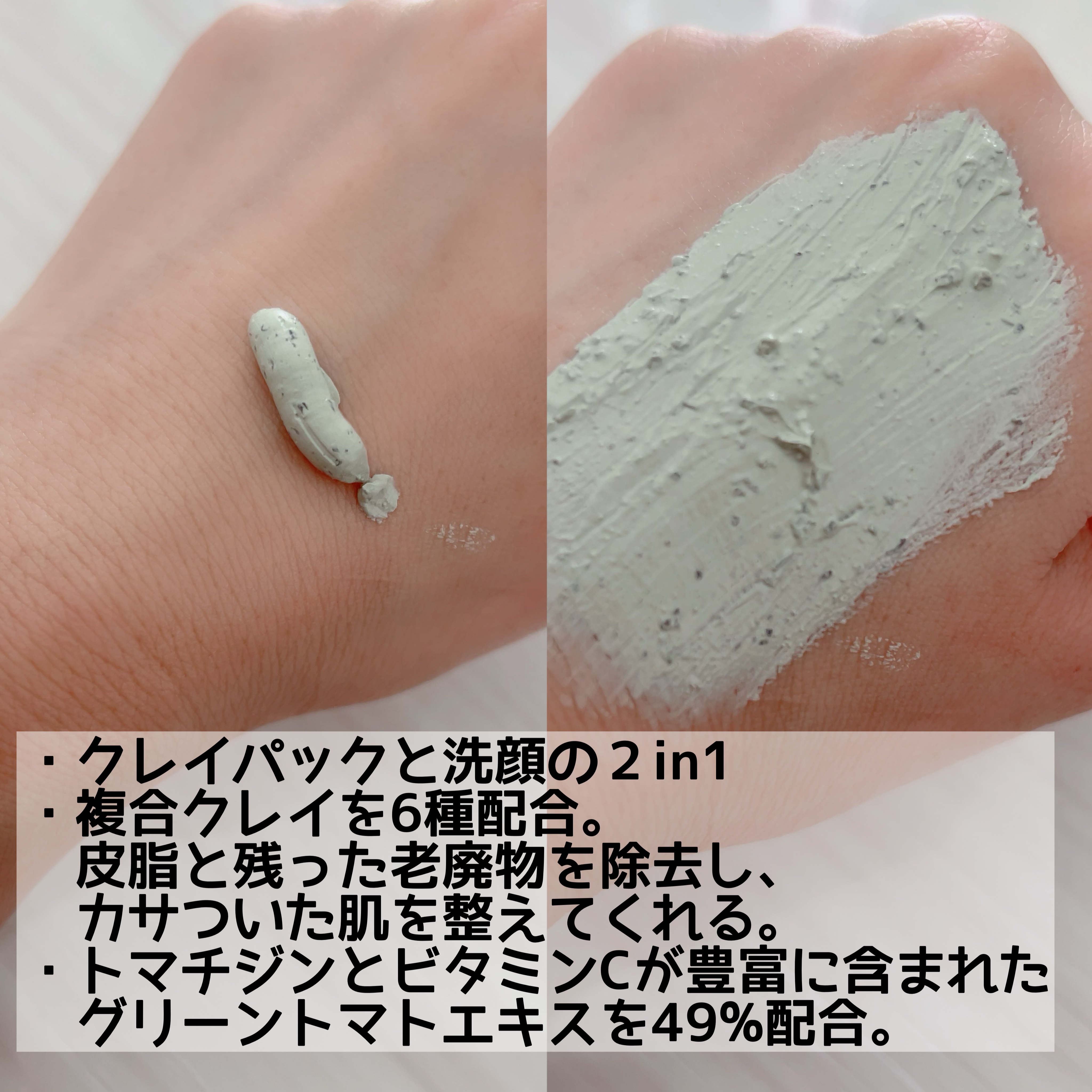 - パック+クレンジングが一度にできる 2In1 天然成分マスククレンザー! 自然のグリーントマトから抽出した純粋なエキスで 毛穴・保湿ケアしてくれます。 6種の複合クレイ+天然成分で優しい使い心地! 毛穴に留まった皮脂をケアしてきれいな肌に整えます。
