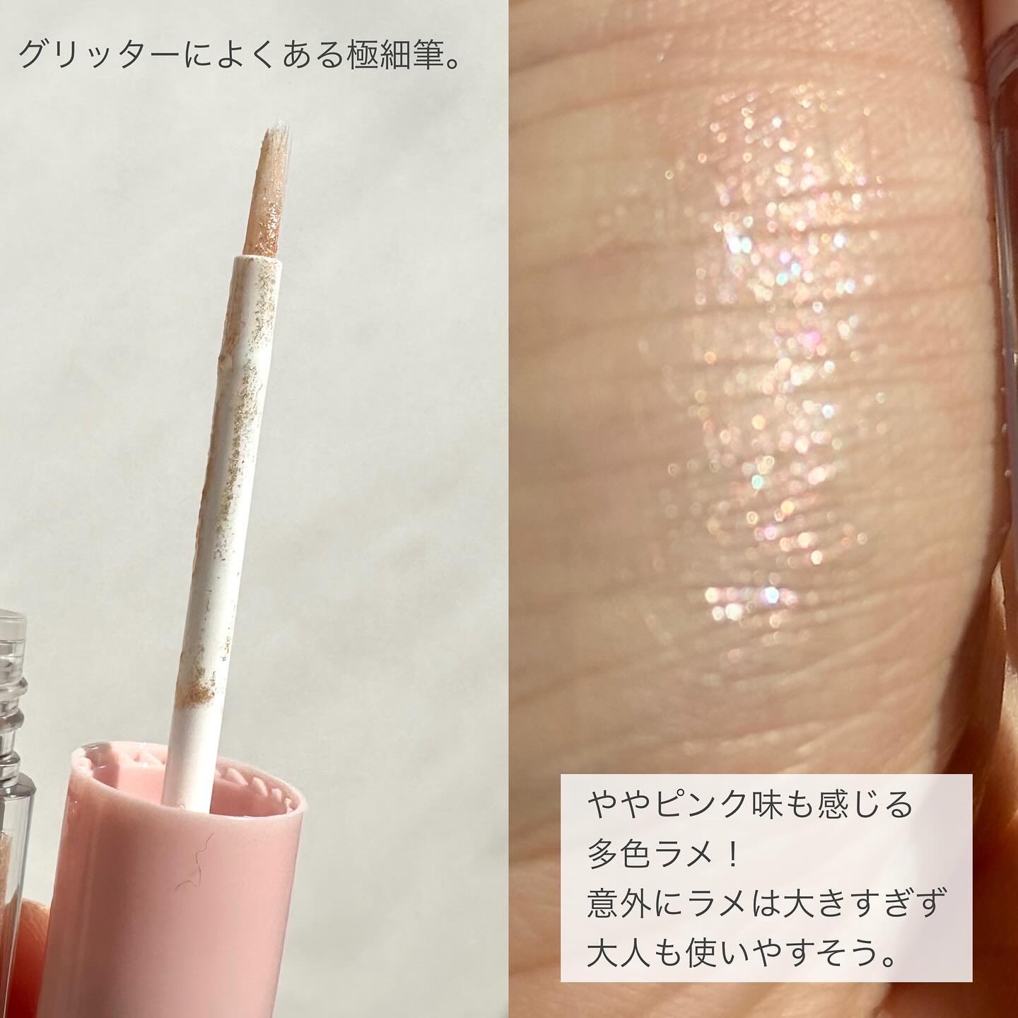 このパレットは、黄味が少なめでブルベにも使いやすいブラウン。 発色はしっかり目だけど、ブラシで調節も可能なので幅広い人に使いやすいパレットだと思います🎀✨ ラメ感も少しずつ異なり、華やかさを抑えたい時は右上を多めに使うと品の良いツヤのあるピンクブラウンメイクになります💎✨ 左上のラメカラーは白っぽいのでどんなアイシャドウとも相性抜群! この可愛い色味と煌びやかなラメは唯一無二です!