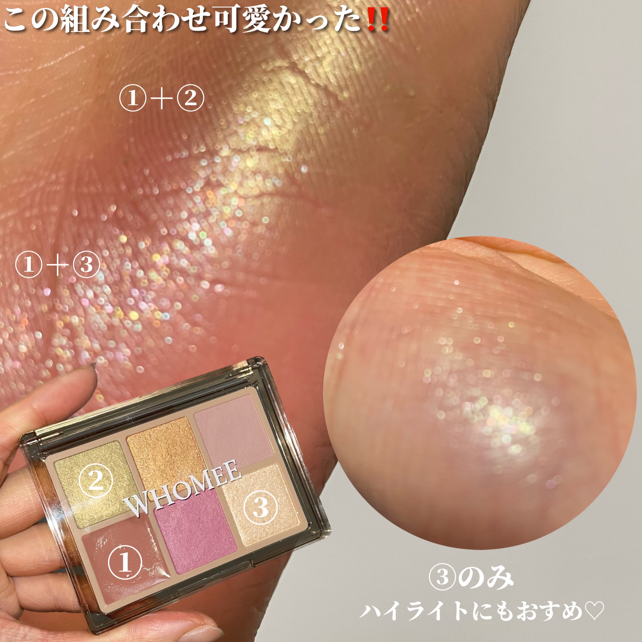 6色の中から、時計回り、反時計回りに4色を重ねるとおしゃれな目元になる!というパレットです。 重ねることで深みが増して、可愛い&ミステリアスな目元に仕上がる素敵なパレットです。 WHOMEEの商品は質感がデパコス級!粉の触り心地が良く、指で塗るのが楽しい♡