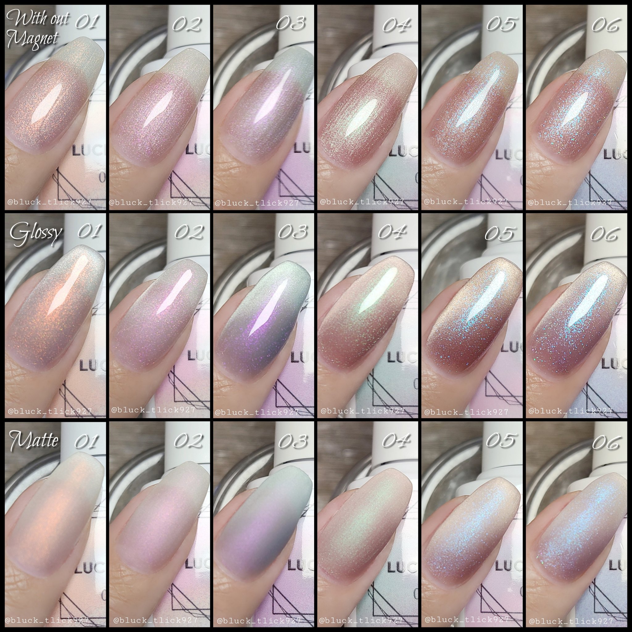 クリア感の高いシアーなベースカラー 1度塗りと2度塗りで発色に差が出ます 5ミクロンのマグネットパウダーを使用 水あめのような質感でスっと馴染みます☺︎ どのカラーも透明度が高く美しいカラーです⟡.·*.