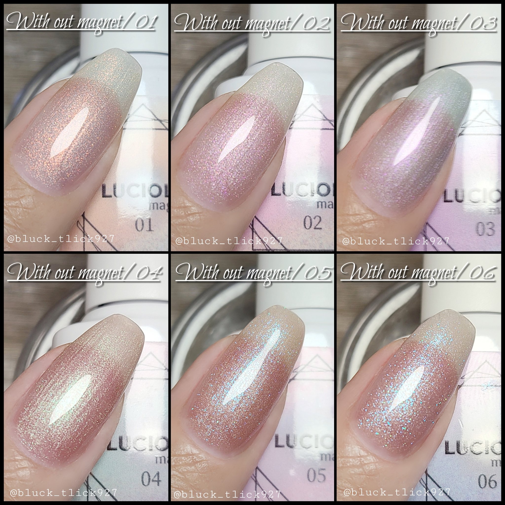 LUCIOLE magnet 6色の自爪色見本ですꕤ︎︎ 淡く優しい蛍カラー♡ マグネットの輝きの合間から覗く 偏光オーロラパウダーが優しく輝きます⟡.·*. 05|ピンク系のベースにブルー系の偏光オーロラパウダー入り