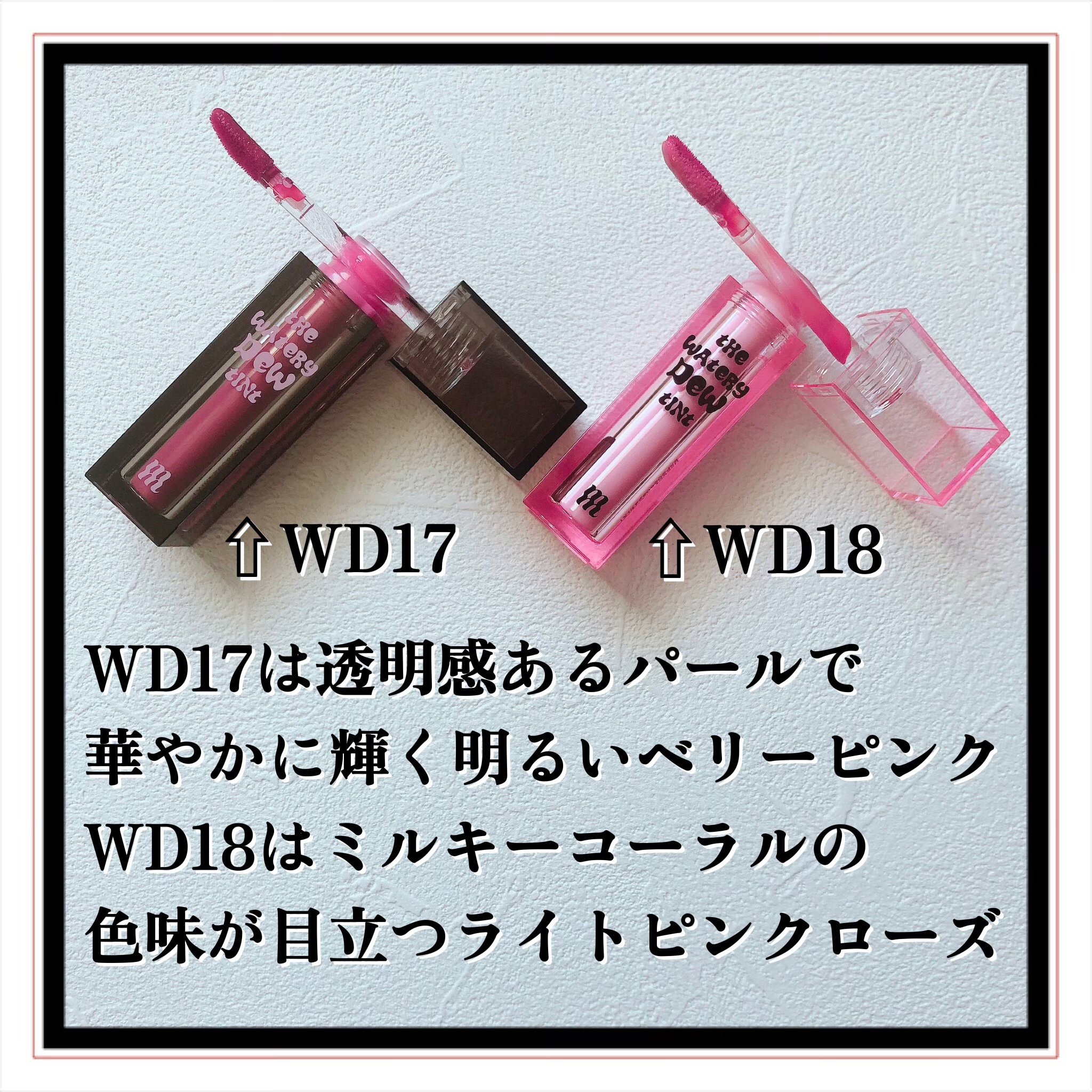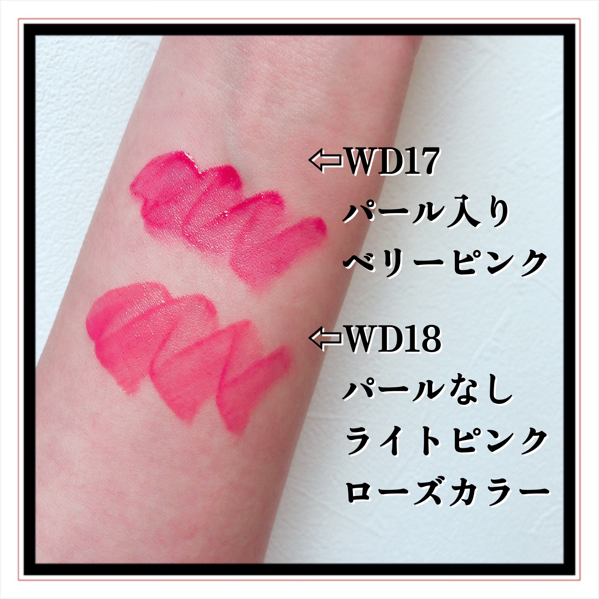 - <WD2 ビトゥン ローズ> 水、ジフェニルジメチコン、リンゴ酸ジイソステアリル、ビスジグリセリルポリアシルアジペート-2、水添ポリイソブテン、ジグリセリン、DPG、セチルPEG/PPG-10/1ジメチコン、イソステアリン酸ソルビタン、ポリソルベート60、ペンチレングリコール、オクチルドデカノール、セテアレス-20、(アクリル酸ヒドロキシエチル/アクリロイルジメチルタウリンNa)コポリマー、スクワラン、フェノキシエタノール、ポリグリセリン-3、ステビオシド、香料、エチルヘキシルグリセリン、グリセリン、シア脂、ツバキ種子油、トリ(カプリル酸/カプリン酸)グリセリル、アルガニアスピノサ核油、ホホバ種子油、アーモンド油、アンズ核油、月見草油、オリーブ果実油、テトラ(ジ-t-ブチルヒドロキシヒドロケイヒ酸)ペンタエリスリチル、カニナバラ果実エキス、マンゴー果実エキス、赤104(1)、赤227、黄5、青1 <WD3 ピンク ヘイズ> 水、ジフェニルジメチコン、リンゴ酸ジイソステアリル、ビスジグリセリルポリアシルアジペート-2、水添ポリイソブテン、ジグリセリン、DPG、セチルPEG/PPG-10/1ジメチコン、イソステアリン酸ソルビタン、ポリソルベート60、ペンチレングリコール、オクチルドデカノール、セテアレス-20、(アクリル酸ヒドロキシエチル/アクリロイルジメチルタウリンNa)コポリマー、スクワラン、フェノキシエタノール、ポリグリセリン-3、ステビオシド、香料、エチルヘキシルグリセリン、グリセリン、水酸化Al、ポリアクリル酸アンモニウム、BG、アルガニアスピノサ核油、シア脂、ツバキ種子油、トリ(カプリル酸/カプリン酸)グリセリル、アーモンド油、アンズ核油、ホホバ種子油、月見草油、オリーブ果実油、テトラ(ジ-t-ブチルヒドロキシヒドロケイヒ酸)ペンタエリスリチル、マンゴー果実エキス、カニナバラ果実エキス、酸化チタン、赤104(1)、赤227、黄5、青1 <WD4 オールウェイズ ヤング> 水、ジフェニルジメチコン、リンゴ酸ジイソステアリル、ビスジグリセリルポリアシルアジペート-2、水添ポリイソブテン、ジグリセリン、DPG、セチルPEG/PPG-10/1ジメチコン、イソステアリン酸ソルビタン、ポリソルベート60、ペンチレングリコール、オクチルドデカノール、セテアレス-20、(アクリル酸ヒドロキシエチル/アクリロイルジメチルタウリンNa)コポリマー、スクワラン、フェノキシエタノール、ポリグリセリン-3、ステビオシド、香料、エチルヘキシルグリセリン、グリセリン、シア脂、ツバキ種子油、トリ(カプリル酸/カプリン酸)グリセリル、アルガニアスピノサ核油、ホホバ種子油、アーモンド油、アンズ核油、月見草油、オリーブ果実油、テトラ(ジ-t-ブチルヒドロキシヒドロケイヒ酸)ペンタエリスリチル、カニナバラ果実エキス、マンゴー果実エキス、赤104(1)、赤227、黄5、青1 <WD6 クラッシュド パンプキン> 水、水添ポリイソブテン、リンゴ酸ジイソステアリル、ビスジグリセリルポリアシルアジペート-2、ジフェニルシロキシフェニルトリメチコン、ジフェニルジメチコン、ポリグリセリン-3、オクチルドデカノール、ポリソルベート60、セチルPEG/PPG-10/1ジメチコン、ラウリン酸ポリグリセリル-10、ペンチレングリコール、1,2-ヘキサンジオール、(アクリル酸ヒドロキシエチル/アクリロイルジメチルタウリンNa)コポリマー、PEG-60水添ヒマシ油、セテアリルアルコール、スクワラン、キシリトール、エチルヘキシルグリセリン、香料、ポリアクリル酸アンモニウム、イソステアリン酸ソルビタン、水酸化Al、フェノキシエタノール、BG、トコフェロール、酸化チタン、酸化鉄、赤227、黄4、黄5、青1 <WD8 ビンテージ カラント> 水、水添ポリイソブテン、リンゴ酸ジイソステアリル、ビスジグリセリルポリアシルアジペート-2、ジフェニルシロキシフェニルトリメチコン、ジフェニルジメチコン、オクチルドデカノール、ポリグリセリン-3、ポリソルベート60、セチルPEG/PPG-10/1ジメチコン、ラウリン酸ポリグリセリル-10、1,2-ヘキサンジオール、ペンチレングリコール、(アクリル酸ヒドロキシエチル/アクリロイルジメチルタウリンNa)コポリマー、PEG-60水添ヒマシ油、セテアリルアルコール、スクワラン、キシリトール、エチルヘキシルグリセリン、香料、イソステアリン酸ソルビタン、トコフェロール、赤104(1)、赤227、黄5、青1 <WD9 ミスター ストレンジャー> 水、水添ポリイソブテン、リンゴ酸ジイソステアリル、ビスジグリセリルポリアシルアジペート-2、ジフェニルシロキシフェニルトリメチコン、ジフェニルジメチコン、オクチルドデカノール、ポリグリセリン-3、ポリソルベート60、セチルPEG/PPG-10/1ジメチコン、ラウリン酸ポリグリセリル-10、1,2-ヘキサンジオール、ペンチレングリコール、(アクリル酸ヒドロキシエチル/アクリロイルジメチルタウリンNa)コポリマー、セテアリルアルコール、PEG-60水添ヒマシ油、スクワラン、キシリトール、エチルヘキシルグリセリン、香料、イソステアリン酸ソルビタン、水酸化Al、ポ