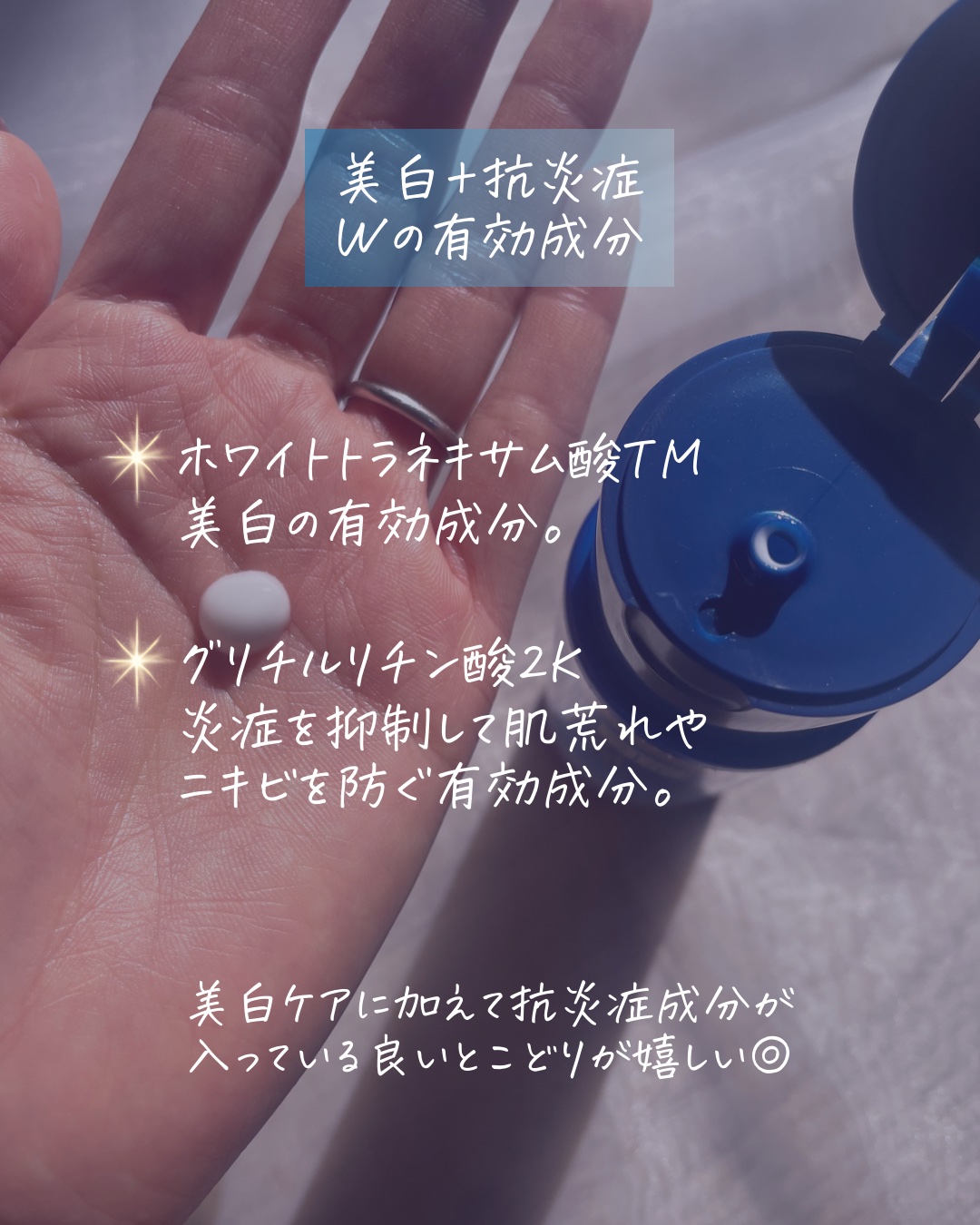 うるおいと白さにこだわる、美容液のようなさっぱりタイプの薬用美白化粧水です。美白有効成分としてホワイトトラネキサム酸、グリチルリチン酸2Kを配合。 紫外線ダメージを受けた肌の角層深くまで浸透し、シミの元であるメラノサイトへアプローチして、うるおいに満ちた美白肌へと導きます。 プチプラで評判がいいから信用出来る
