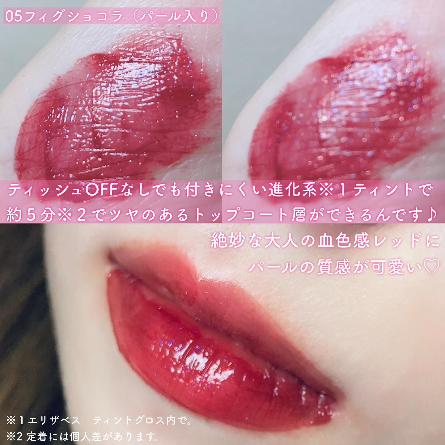 - 塗ると変化! トップコート形成。 ガラスのようなツヤ仕上がり。 トップコートが色・ツヤ・うるおいラッピングし、つけたての仕上がりを長時間*1守る。 ティッシュオフなしでもマスクにつきにくい進化系*2ティントグロス。 <当社独自処方> 塗ってしばらくすると、ティント層の上に、透明なツヤトップコート層を形成。 ティント層をしっかりコートし、つけたての色・ツヤ・うるおいをキープ! ●唇の荒れ・乾燥を防ぎ、使うたびうるおう 5つの美容液成分配合 ・ヒト型セラミド*3、ラ・フローラEC-12®*4(乳酸菌)、ヒアルロン酸(うるおい成分) ・ローズヒップオイル*5、イブニングプリムローズオイル*6(エモリエント成分) ●無香料 ●縦じわ補正*7 ●唇くすみ補正*7 ●塗りやすいフロッキーチップ ●MADE IN JAPAN *1当社調べ。日中の活動時間 *2エリザベスティントグロス内で *3セラミドNG *4エンテロコッカスフェカリス *5カニナバラ果実油 *6月見草油 *7メイクアップ効果による