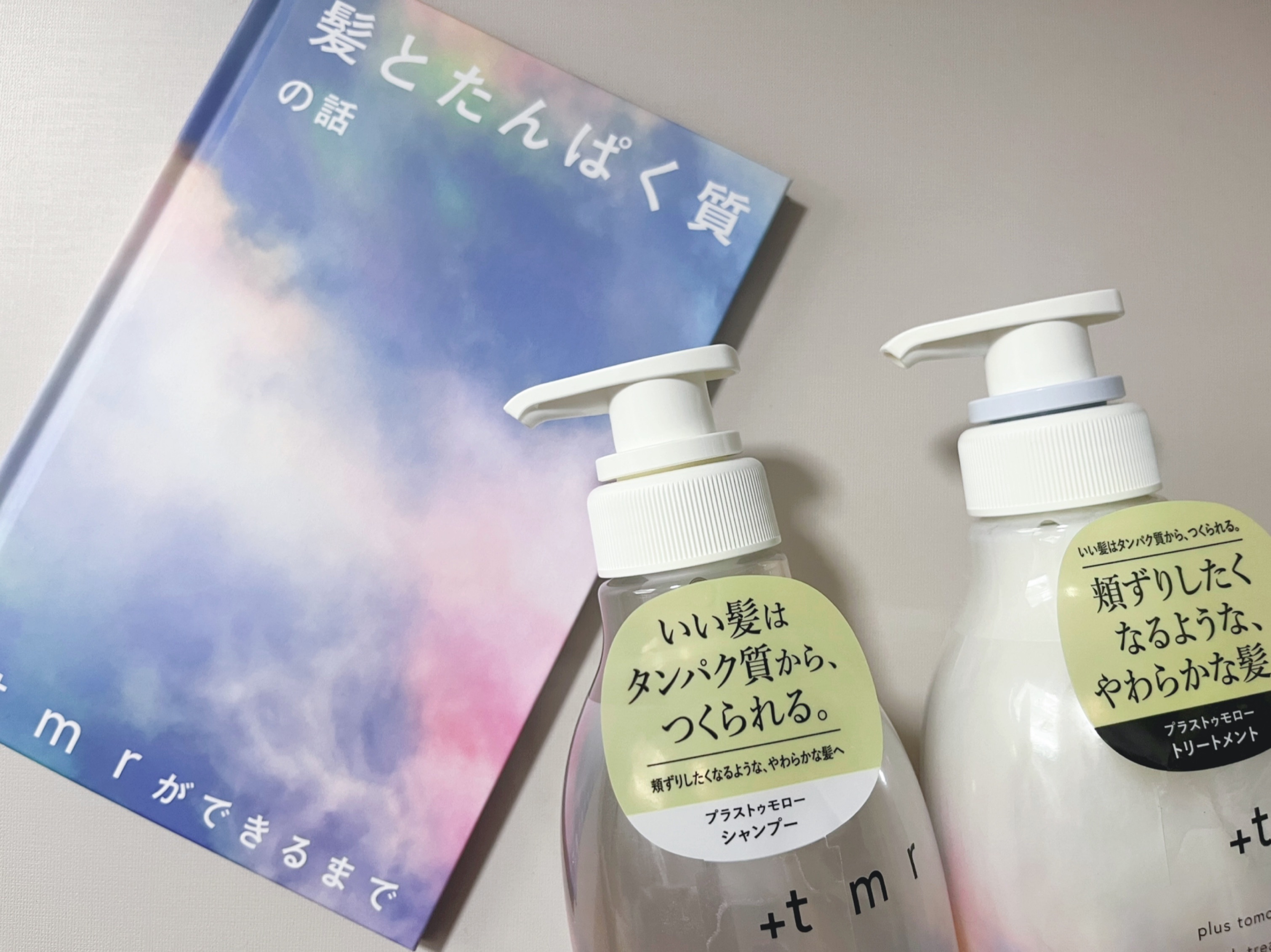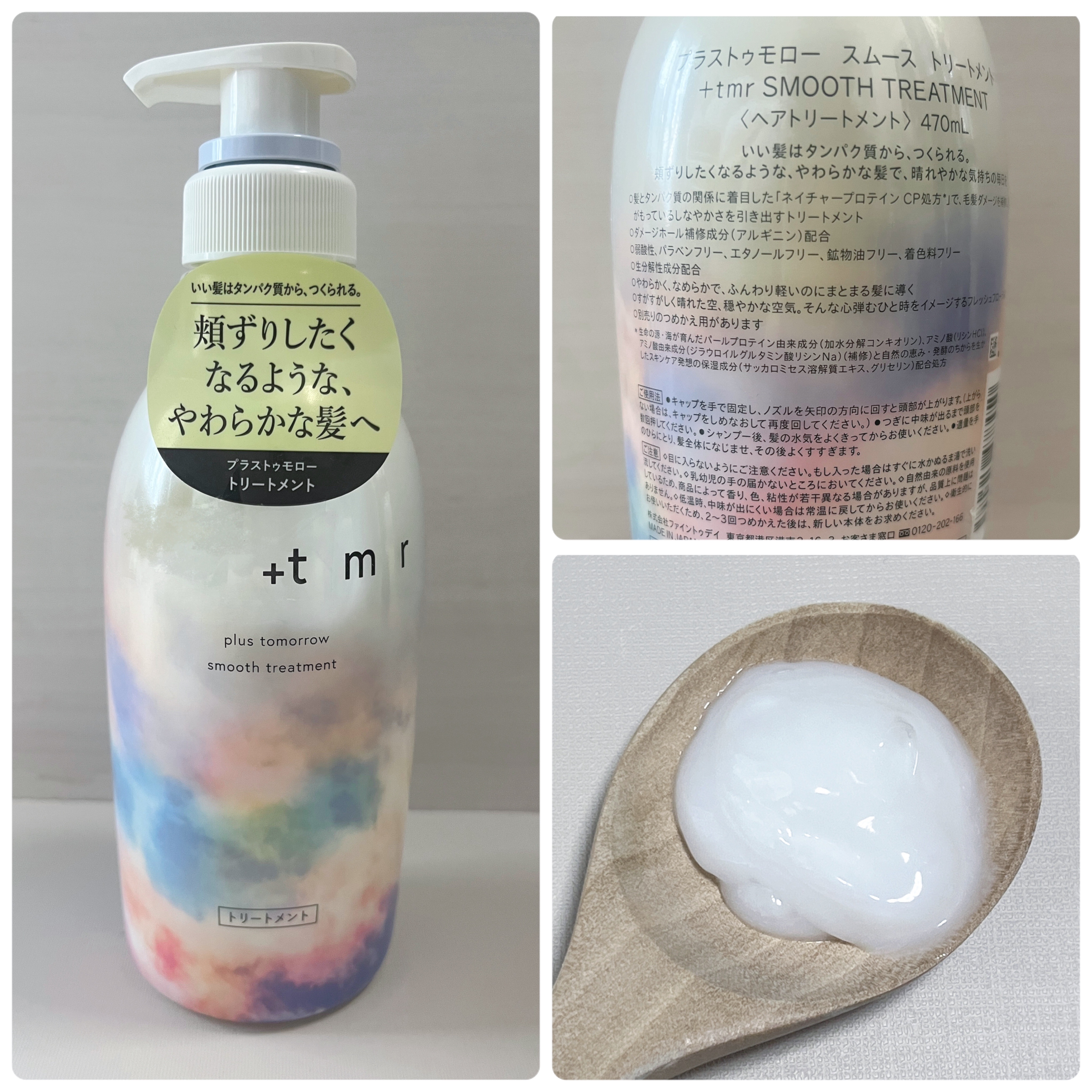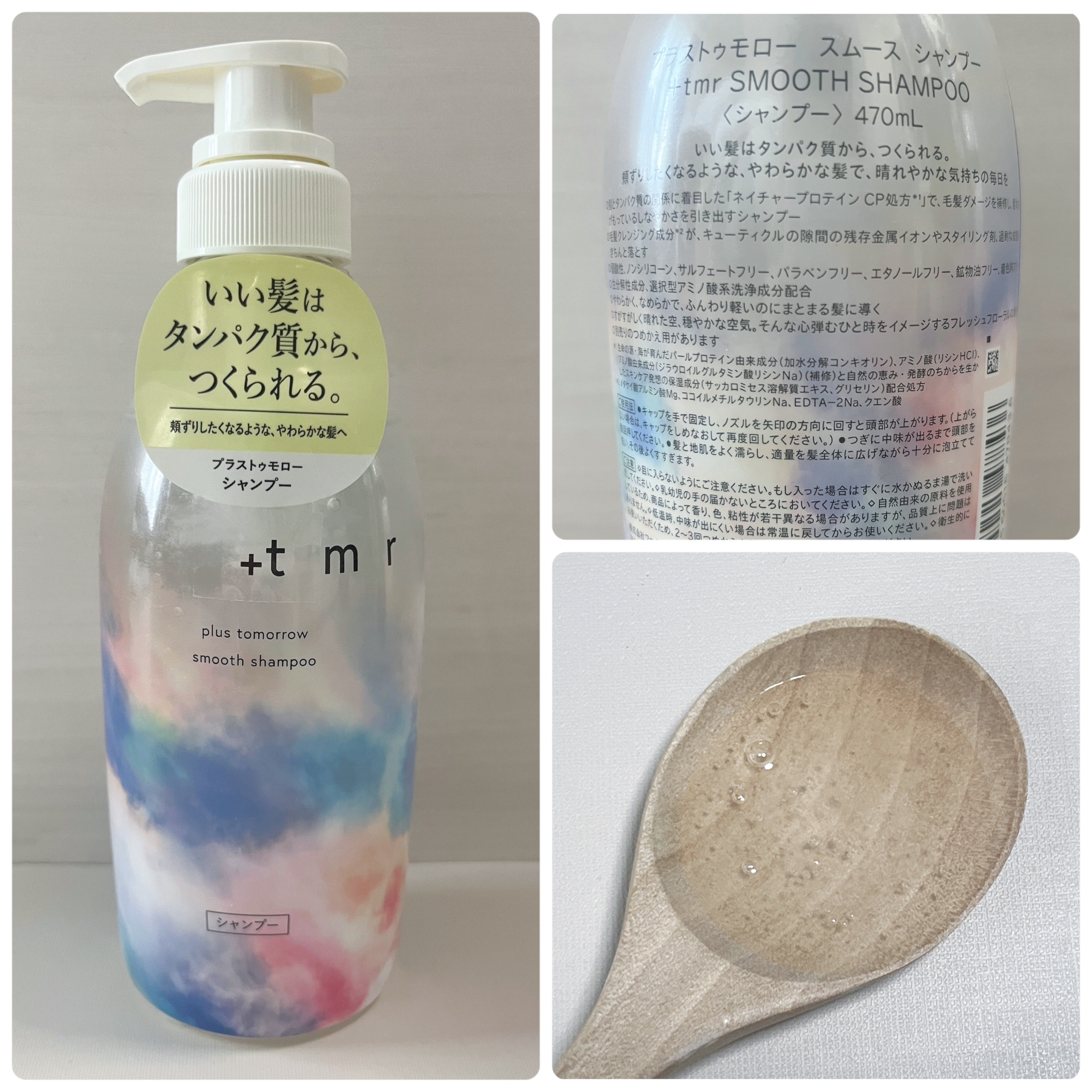 - 髪とタンパク質の関係に着目した「ネイチャープロテインCP処方※2」毛髪ダメージを補修し、髪本来がもっているしなやかさを引き出します 処方アプローチ: しなやかな「頬ずりしたくなる髪」へと導くタンパク質全方位アプローチ※4 ♦ダメージを受けた髪の「空洞化」にも着目。 ダメージホールさえも、タンパク質のもととなるアミノ酸で補修し、成分を抱え込める状態へ。 ➢ ダメージを受けた髪は、スポンジのように毛髪内部が空洞化。髪に元々蓄えられている成分が流失しダメージホールが発生します。また、穴があいた状態ではいくら内部を満たすかのように成分補給をしても、ため込むことができず流れ出る状態に陥ります。 +tmrはタンパク質の元となるアミノ酸(アルギニン)でダメージホールを補修。成分を抱え込み、髪をみっちりとした状態へと導きます。 ♦髪とタンパク質の関係に着目した「ネイチャープロテインCP処方※2」 パール由来タンパク質成分を含む+tmrの独自処方「ネイチャープロテインCP処方」により、毛幹、および髪の85%~90%を占めるコルテックスへとアプローチ。髪のダメージを補修します。 ➢髪のしなやかさを司る毛髪タンパク質の最小単位。その直径はマイクロスコープでも確認することができない、わずか1.2nm、ダメージを受けることでバネ状が伸び縦方向への引っ張りにも影響、切れ毛の原因の一つにもなります。ミクロレベルで髪を補修し、ダメージにより失われた髪の弾性を健やかな状態へと導きます。 ➢カラーやパーマによりダメージを受けた髪は、コルテックス内部のタンパク質などの成分を留めるための結合がもろくなり、成分を抱え込めない状態に。縦横無尽に張り巡らされた毛髪内結合の強化をサポートし、髪が切れにくい状態へ。 香調: +tmrのこだわりは心まで満たされるかのようなフレッシュフローラルの香り ♦「頬ずりしたくなるほど、やわらかな髪」に気持ちまで弾むような香りにこだわりました。すがすがしく晴れた空、穏やかな空気、そんな心弾むひと時をイメージしたフレッシュフローラルの香りです。 パッケージデザイン: 見ただけで心が弾む、空に浮かぶ彩雲(さいうん)をイメージ ♦+tmrと一緒なら、今日が、明日がもっといい日になる。そんな未来への希望が広がるデザインにサステナブルな想いを込めたパッケージデザインへと仕上げました。 環境への配慮 ♦シャンプー・トリートメントの本体ボトル※5約66%がリサイクルPETを使用 ♦詰め替え用パッケージの約44%に植物由来のプラスチック、約7%にリサイクルPETを使用 先行発売:2023年11月1日より全国の@cosme STORE / @cosme SHOPPINGにて先行発売 全国発売:2024年2月より全国順次展開 ※2 生命の源・海が育んだパールプロテイン由来成分(加水分解コンキオリン)、アミノ酸(リシンHCl)、アミノ酸由来成分(ジラウロイルグルタミン酸リシンNa )(補修)と自然の恵み・発酵のちからを生かしたスキンケア発想の保湿成分(サッカロミセス溶解質エキス、グリセリン)配合処方 ※4 ネイチャープロテインCP処方と、空洞化をケアする成分、タンパク質の元となるアミノ酸「アルギニン」でそれぞれアプローチすることの総称 ※5 ポンプ部分を除く