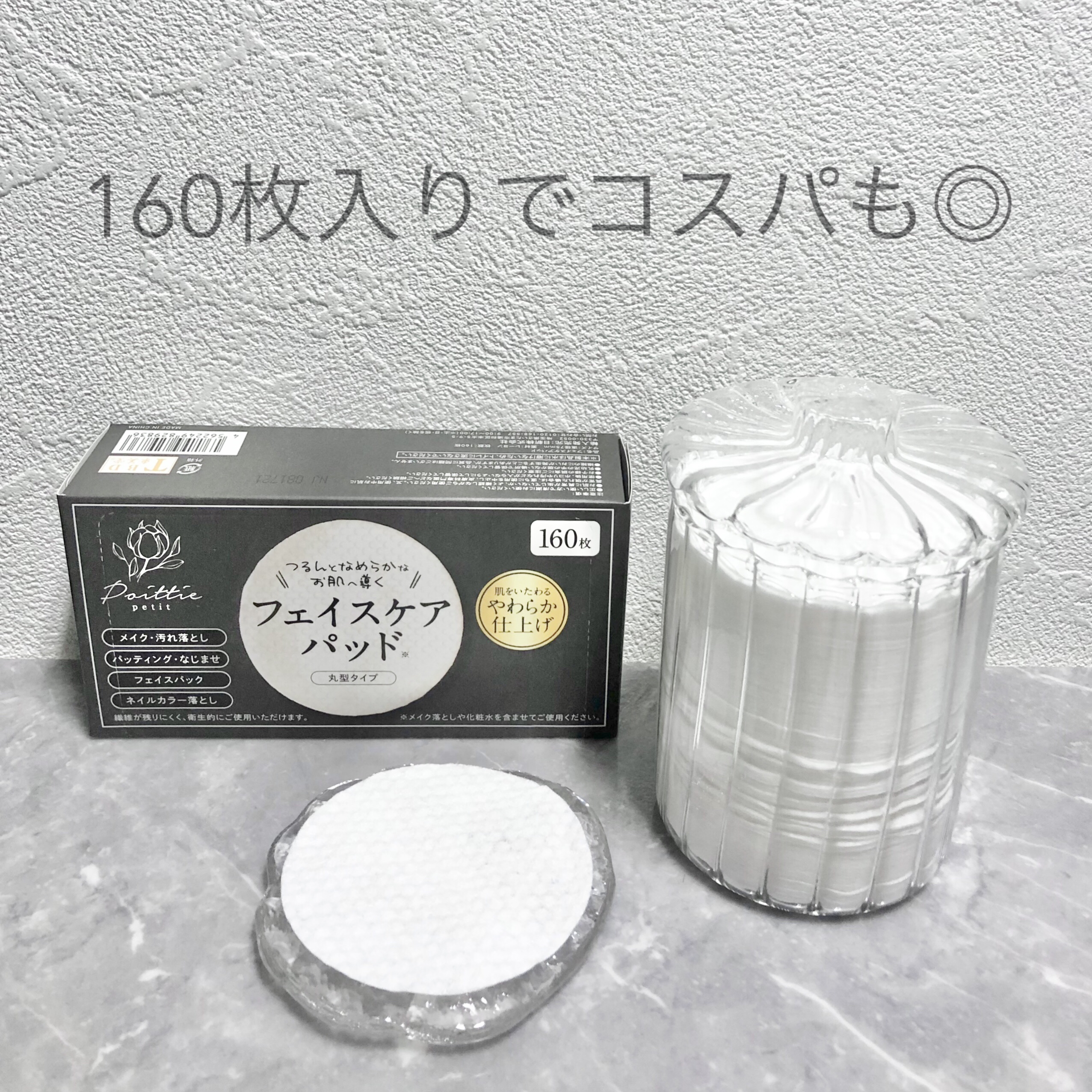 薄いので、化粧水をうっかりぽたぽたこぼしがち。 でも、エンボス加工になってるので、しっかり汚れがとれてる感じがあって良き。 160枚で200円程度なので、コスパも良し。 パッドを買っても良いけど、お気に入りの化粧水使いたいって場合にもおすすめ。