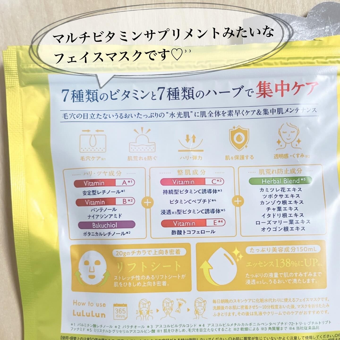 - ルルルンからビタミンたっぷりの化粧水フェイスマスクが新登場。 7種類のビタミン※1と7種類のハーブ※1で肌全体を素早くケア&集中肌メンテナンス。 新開発のフェイスラインに密着するシートで肌を引き締めながら肌のすみずみ※2までうるおいで満たし、毛穴の目立たないうるおいたっぷりの“水光肌”へ。 (※1 全て保湿成分として ※2 角質層まで)