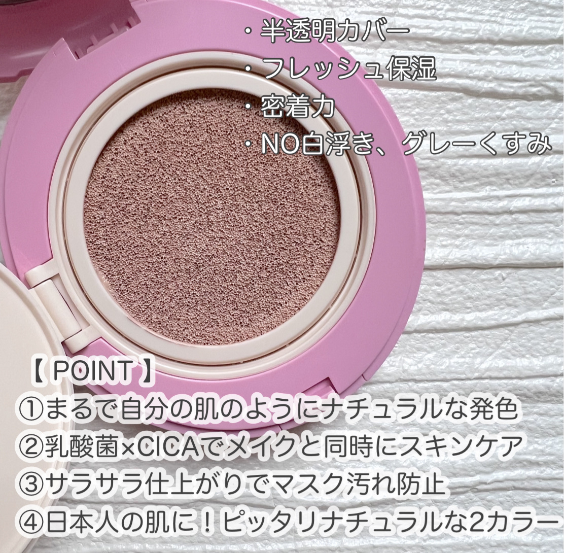 - タッチするだけでかんたん「ツヤめくキレイな素肌」へ。 何度重ねてもムラになりにくくピタッと密着しなめらかな肌印象に。 うす付きながらも肌悩みはしっかりフルカバー! CICA成分(※1)&乳酸菌(※2)・ビフィズス菌(※3)・酵母菌由来成分(※4)配合でメイク中も美肌ケアを叶えます。 (※1.ツボクサエキス ※2.乳酸桿菌培養溶解質、乳酸球菌培養溶解質 ※3.ビフィズス菌培養溶解質 ※4.サッカロミセス培養溶解質液 ※1~4.全て保湿成分)