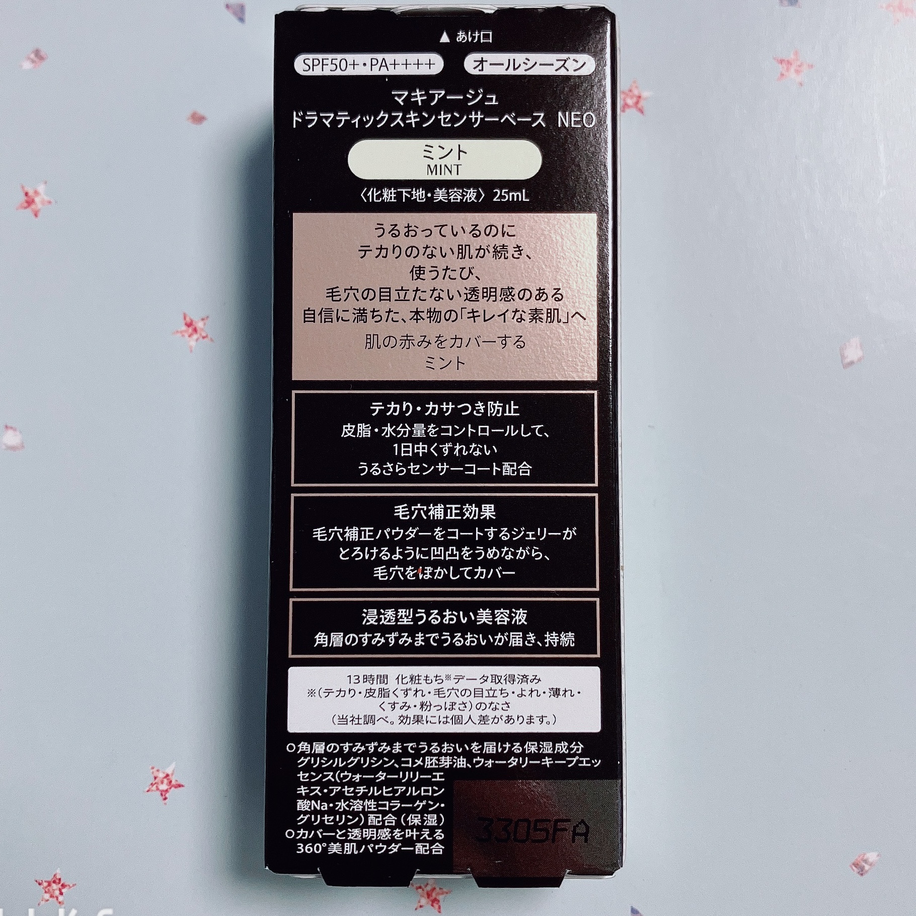 - ドラマティックスキンセンサーベース NEO<化粧下地・美容液> 売上 No.1化粧下地*のドラマティックスキンセンサーベース EX UV+のくずれ防止効果、毛穴カバー効果をさらに強化し、 新たにスキンケア機能まで搭載した毛穴レスくずれ防止下地です。 SPF50+・PA++++で、強力な紫外線から肌を守ります。 ◆POINT1 テカリ・カサつきダブルで防ぐ最強くずれ防止効果 新たに肌全体を覆う「うるさらセンサーコート」を搭載。湿度に応じて、コートという面状で水分の通しやすさを調整することが可能となったため、どんな時でも快適な肌状態をキープする力が向上! べたつく環境では、うるさらセンサーコートが水分透過性を高めるため、さらさらキープ 乾燥する環境では、うるさらセンサーコートが水分透過性を下げるため、うるおいキープ ◆POINT2 塗った瞬間「キレイな素肌」な毛穴補正効果 毛穴補正パウダーに加え、新配合・オイル生まれのポアレスジェリーがとろけるように凹凸をうめながら毛穴をぼかしてカバーし、透明感のある仕上がりに。 ◆POINT3 使うたび うるおうスキンケア効果 浸透型うるおい美容液が、角層のすみずみまでうるおいを届け、持続。使うたび、うるおって毛穴が目立たない本物の「キレイな素肌」へ。 *インテージSRI+, 化粧下地市場(期間2022/1~2022/12), 品種別金額シェア ※ミントは企業限定発売。取扱企業は、ウエルシアグループ、スギ薬局、ツルハグループ(ツルハドラッグ・くすりの福太郎・ドラッグストアウェルネス・ドラッグストアウォンツ・くすりのレデイ・杏林堂スーパードラッグストア・B&D ドラッグストア・ドラッグイレブン)、トモズです。 店舗によってお取り扱いがない場合がございます。