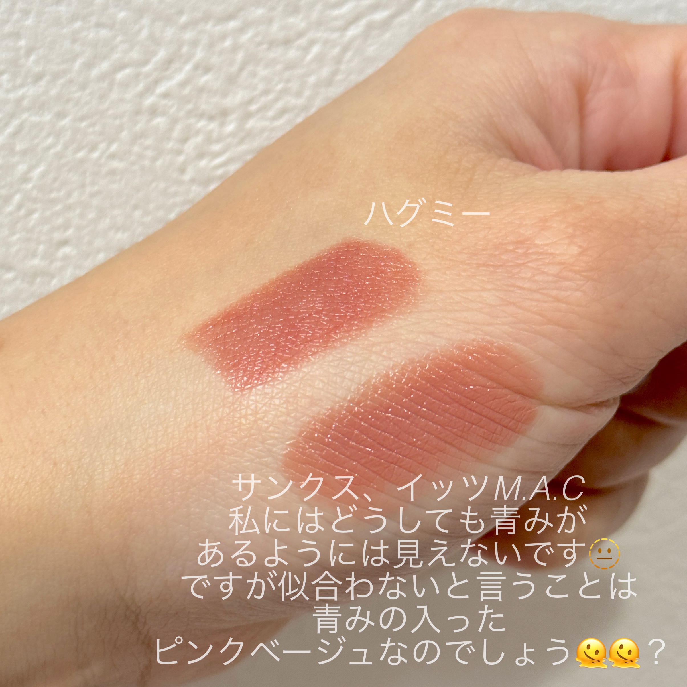 シアー感があってツヤも綺麗で 多少落ちにくいかな?と思いました! ハグ ミーはめちゃくちゃ使いやすい色味でした! 唇につけてみるとめちゃくちゃちょうど良くて ツヤも綺麗でとても気に入りました! サンクス,イッツ M·A·C!は 色味は好きな感じなのに 唇につけると浮く感じがして この色は失敗したな!と思いました!