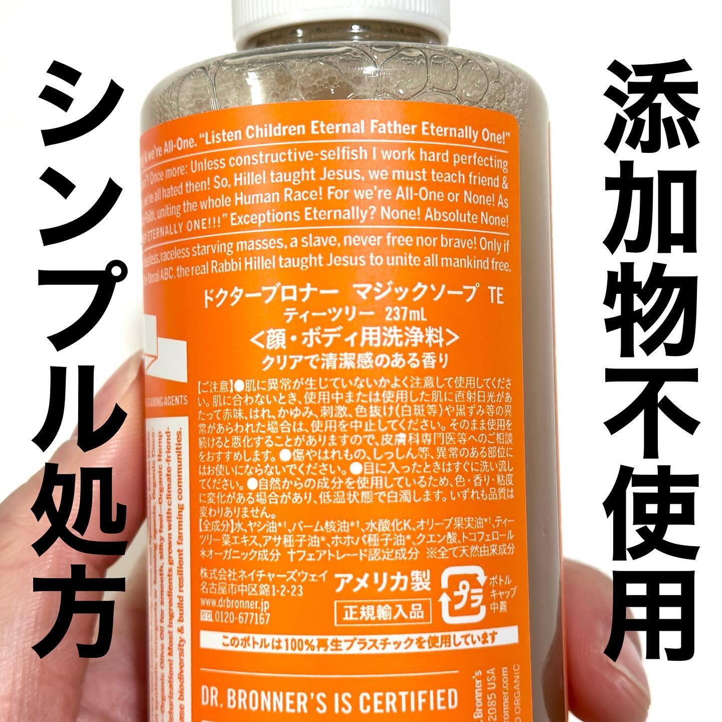ドクターブロナーのマジックソープ。今回初めてシトラスオレンジを使ってみました🍊 一本で洗顔もメイク落としもボディソープにも使える優れものなんです☺️ 泡立てれば立てるほど、シトラスオレンジの香りがバスルームいっぱいに広がって、とっても穏やかな気分になれます。