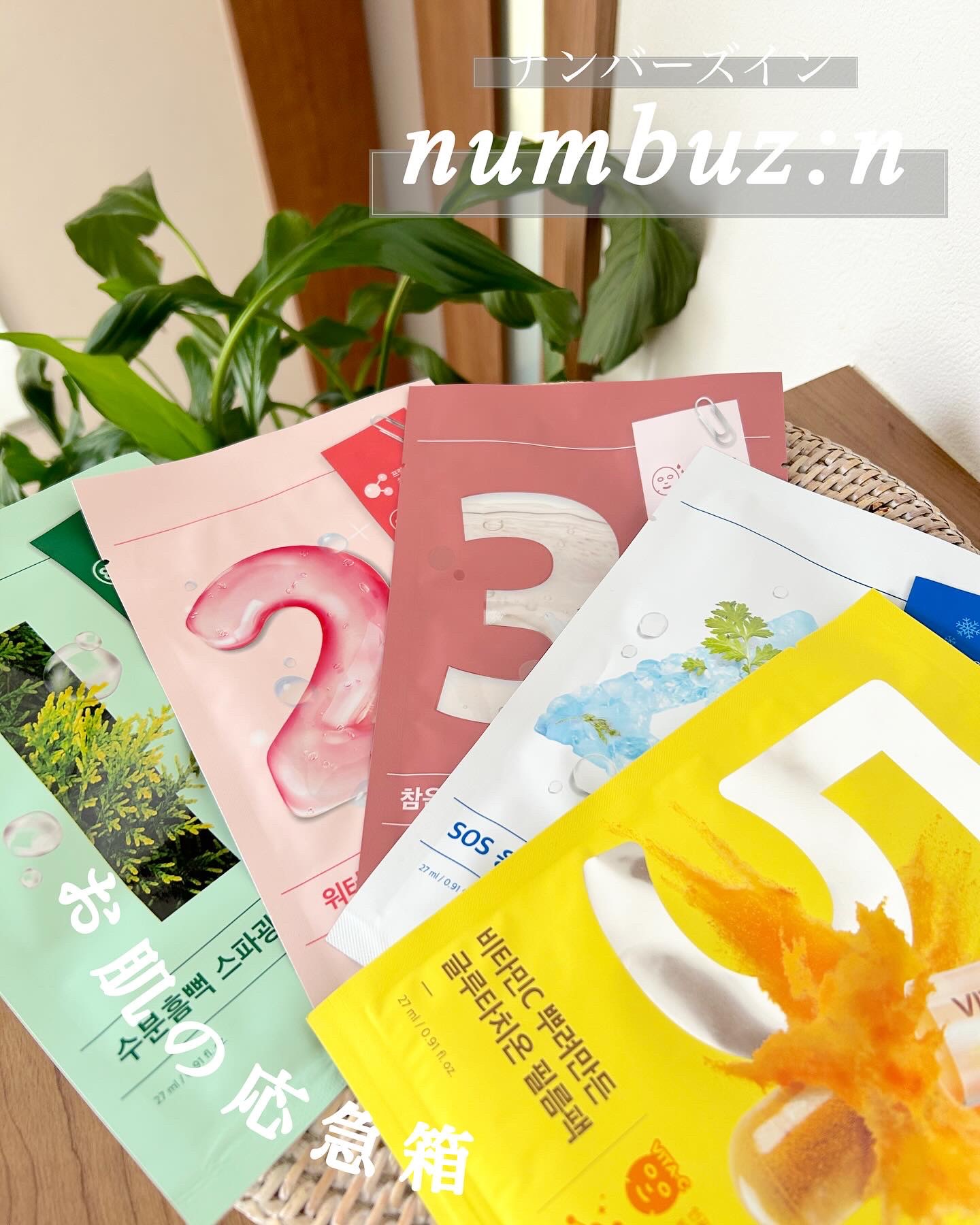 ナンバーズイン人気のパック5種使ってみたまとめ◎【numbuzin】💚1番ヒノキ水81%シートマスク驚きの糸引くパック。ヒノキの香りが心地良い〜🩷2番うるもち65%コラーゲンシートマスクゼリーみたいにぷるぷるなマスク。乾燥が気になるときに◎❤...
