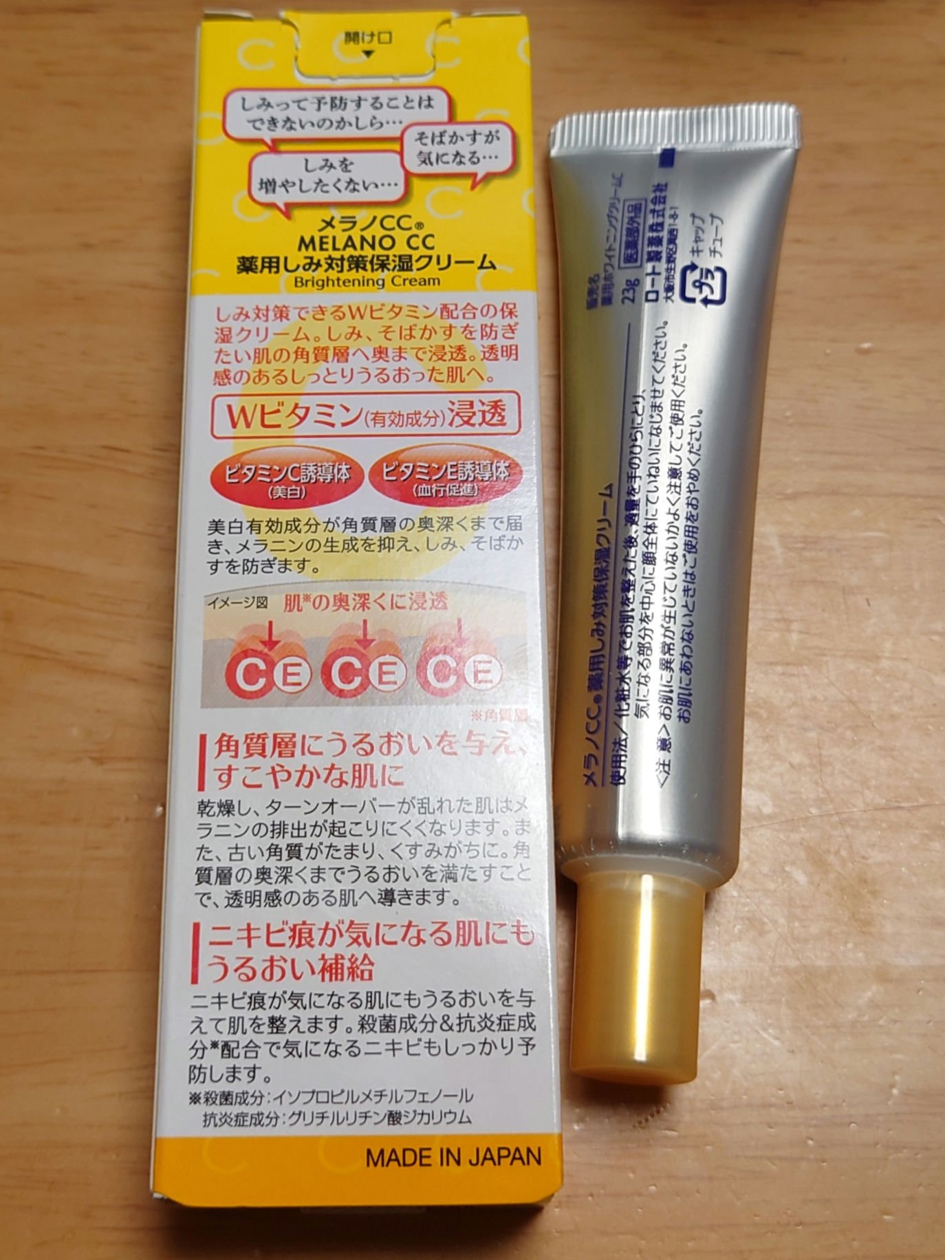 - 「メラノCC 薬用しみ対策 保湿クリーム」は、美白有効成分「ビタミンC誘導体*1」と整肌成分「ビタミンE誘導体*2」の働きで、メラニンの生成を抑え、しみ・そばかすを防ぐ保湿クリーム。 肌の角質層すみずみまで浸透。メラニンの生成を抑え、しみ、そばかすを防ぎ、透明感のあるしっとりうるおった肌へ。ニキビ痕が気になる肌にも、うるおいを与えて肌を整えます。イソプロピルメチルフェノール(殺菌成分)とグリチルリチン酸ジカリウム(抗炎症成分)配合で、気になるニキビもしっかり予防。伸びがよくべたつかない、みずみずしい使用感です。 化粧水や乳液等で肌を整えた後、パール粒1個分くらいを手のひらに取り、気になる部分を中心に、顔全体になじませてください。朝晩の使用で約2ヶ月分です。 *1:L-アスコルビン酸2-グルコシド *2:トコフェロール酢酸エステル