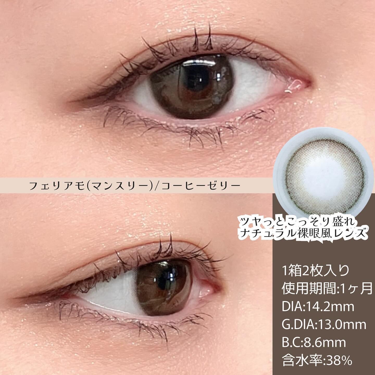 - ※2025年6月以降、商品パッケージ裏面・側面の一部表記を順次変更いたします。尚、これにかかる商品の交換・返品は承っておりません。 どんな瞬間にも溶け込む誰からも愛される瞳へ feliamoの由来は felice amore~幸せな愛~ 瞳から愛されオーラを放つ好印象レンズで女性らしさと品を演出。 オンも、オフも、特別な日も。 どんな場面にも溶け込むレンズラインナップで誰からも愛される瞳に。 ■うるつや透明感 × こっそり盛れ ナチュラルレンズ Coffee Jelly(コーヒーゼリー) ■じゅわっと透明感 × ふんわり盛れ すこし大きめレンズ Affogato(アフォガード) ■ナチュラル細フチ×裸眼盛れ トキメキうるみレンズ Oolong Tea(ウーロンティー) ■トレンド太フチ×くりっと盛れ 無敵ブラウンレンズ Tarte Tatin(タルトタタン) ■じゅわっとフチ×甘かわ盛れ あざとブラウンレンズ Tiramisu Ring(ティラミスリング) ■シュガーパール 大人気カラーBrulee Pearl(ブリュレパール)の色違いグレーレンズ! 細フチの使いやすいグレーで、どんな瞳の色(黒目・茶目)でもナチュラルに光をとりこみ、うるっと奥行きのあるこなれ可愛い印象に。 おでかけにぴったりなレンズです! 清楚な瞳になれるヒ・ミ・ツは・・・? ちゅるん細フチ×うるキラグレーカラー! ■メルティバター 盛れるのにバレにくい、毎日使えるナチュラルブラウンレンズ! じゅわっととろけるようなブラウンで、ふんわりやさしげな瞳に! どんなメイクにも似合うから毎日使える!自然に盛れる大きめブラウンレンズはfeliamoにお任せ♡ 多幸感のある印象の瞳のヒ・ミ・ツは・・・? ぼかしナチュラルブラウン×じゅんわりとろけるブラウンカラー カラーコンタクトレンズの不適正使用による眼障害の危険性等などがあります。 ●コンタクトレンズは高度管理医療機器です。不十分な洗浄・消毒など不適切なケアや、長時間・交換期間を超えた装用により、アレルギー性結膜炎、角膜感染症、角膜潰瘍等の重篤な眼障害が発生する危険性があります ●ご使用前に取扱説明書を確認してください 使用上の留意事項 ●眼科医院等を受診してからお求めください ●眼に異常を感じたら直ちにレンズ使用を中止し、お近くの眼科等で診察を受けてください ●医師の指示にしたがってご使用ください ●コンタクトレンズを装用する場合、自覚症状がなくても、眼科医院等での定期検査を受けてください ●レンズに不具合がある場合は使用しないでください