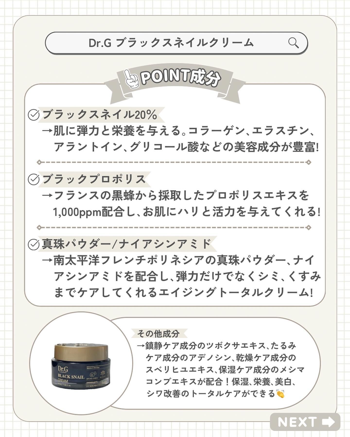 ブラックスネイルと低刺激のレチノールを配合した美容液 とろみがあってミルキーなテクスチャー なめらかにすべるように伸びて気持ちいい使用感で好き ブラックスネイル20%配合クリーム もっちりとした弾力を感じるテクスチャー なめらかに伸びてべたつかない Dr.Gが開発した独自成分のブラックスネイルレチノールは刺激が少なく効果的◎ アトピーもちの敏感肌、乾燥肌だけどトラブルなく使えてるよ♪