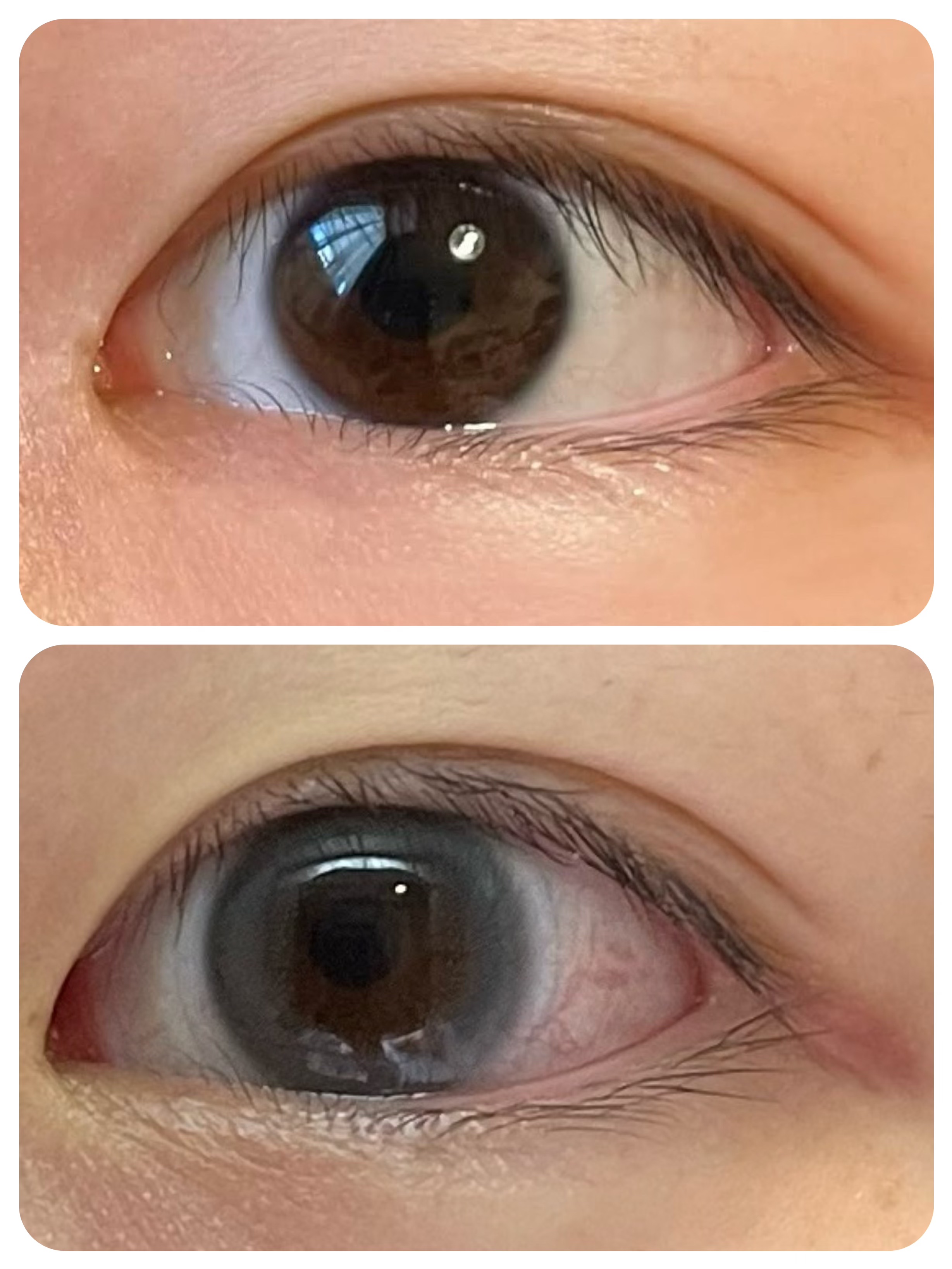 水光コンタクトのブラック 中と色の差があまりないからフチは目立たない、輪郭がはっきりする程度 ベルベージュよりも水光感は目立たなくてよりナチュラル OLENS グローイのブラックに似てる