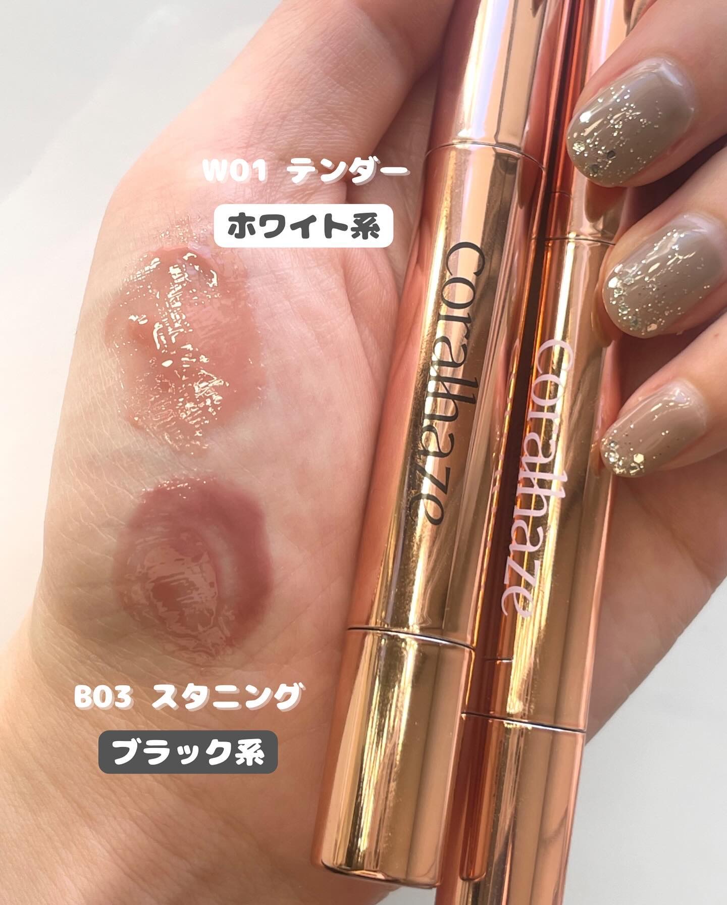 - White コンセプト / Blackコンセプトでお馴染みのCoralhazeから新たに6色追加となります。 特にBlackコンセプトに対する期待の声が寄せられていたこともあり、今回Black コンセプトから既存のBlack LineよりもさらにトーンダウンしたDark Lineが新登場。 番号の前にWが付いている商品はwhite Line、Bがついている商品はBlack Line、Dが付いている商品はDark Lineとなります。 1.唇に軽くメルティングされ蜂蜜を塗ったようなプルンとした輝きを与えます 2.プランパー成分配合でクーリング感とともにふっくらとしたボリューム、ツヤ感を与えます 3.ベタつきの少ないテクスチャーで重ね塗りしても快適に使用 4.パーソナルカラーに合わせて選べる10種類のカラー 5.高級感のあるゴールド色の容器を使用し感性的な満足感をお届けします 6.唇を保護し、保湿感を与えるスキンケア成分を配合 韓国では 「自身が持っている魅力をコーラルヘイズがより引き出す」 というパステルカラー調のコンセプトになっておりますが日本では今までの韓国コスメにはない、Black or White コンセプトになっております。 Black Lineはブラウンチョコレートを一滴垂らしたようなカラー White Lineは生クリームを一滴垂らしたようなカラー