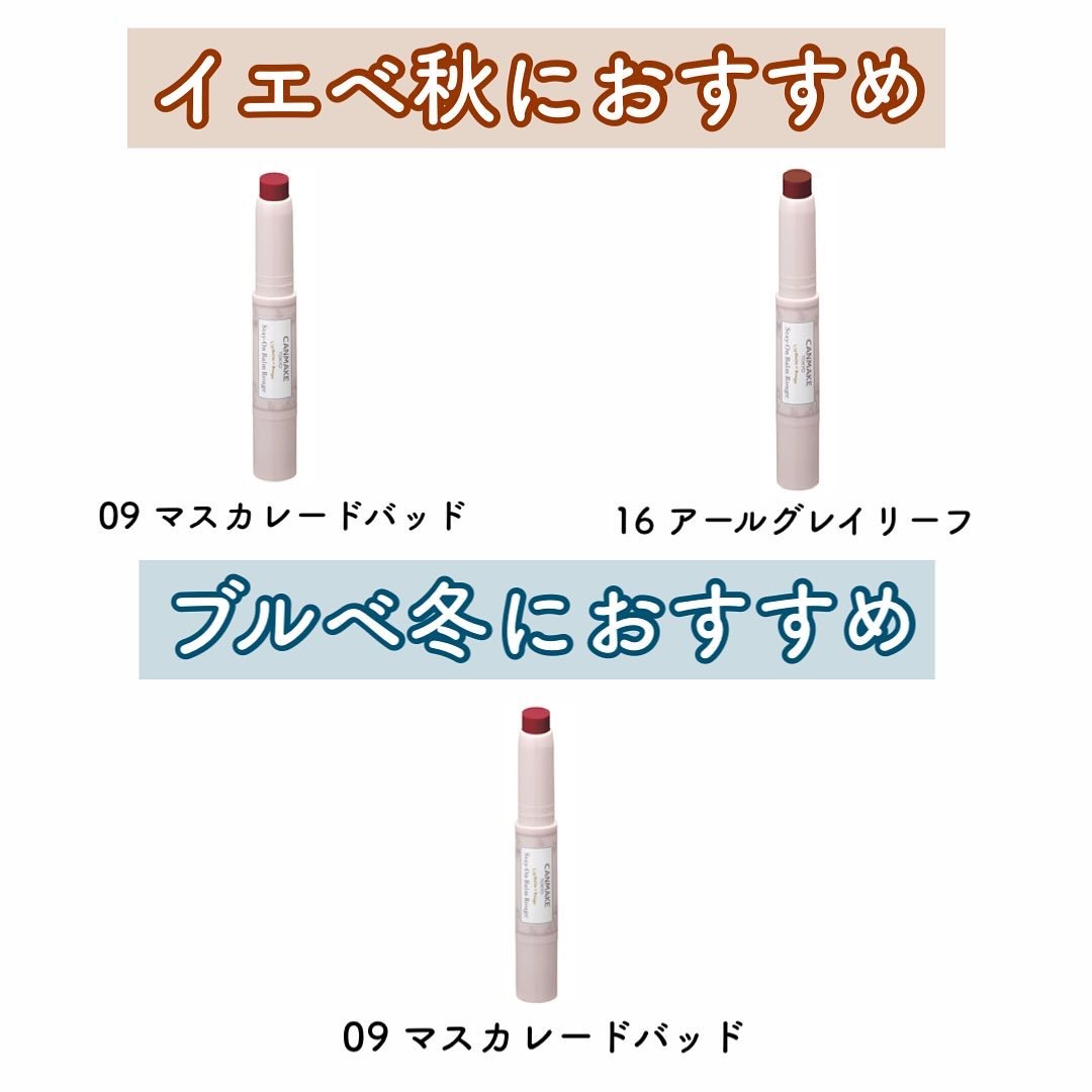 温もりのあるオレンジベージュ (01)バタースコッチ 血色の感じるヌーディーピンク (02)モモ 気品まとうローズレッド (03)ワインベリー 甘い雰囲気を出せるモーヴピンク (06)ラズベリーケーキ 上品なピンクベージュ (T02)ロゼミルクティー ピュアな発色の真紅レッド (T03)ディアレストレッド 明るくオシャレなオレンジ [02]スマイリーガーベラ 深みのあるブラウン [16]アールグレイリーフ