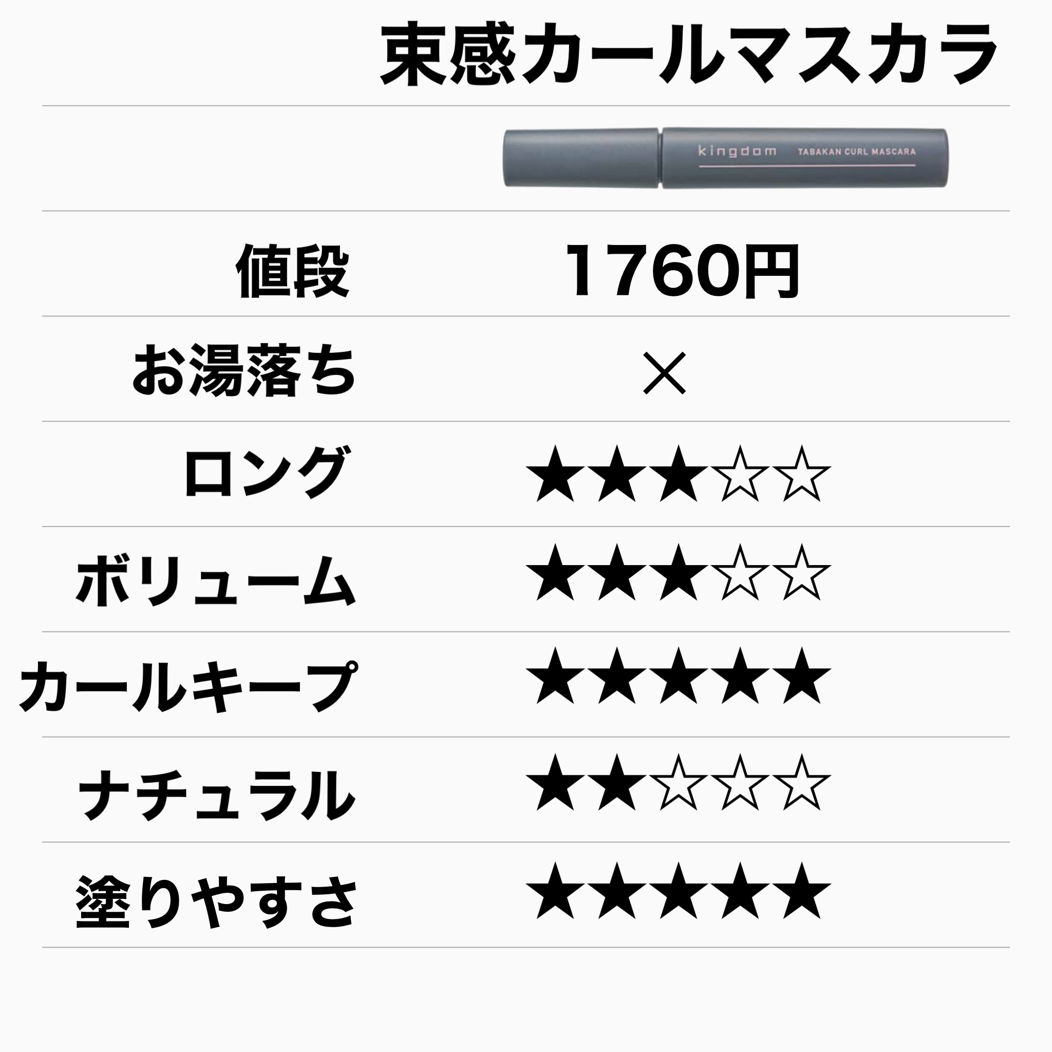 これは確かに束まつ毛作れる…!*キングダム束感カールマスカラ/クリアブラック¥1,760長らくブラウンを選んでいましたが黒まつ毛に戻そうかな〜と思い、キープ力が高いと噂のキングダムを購入。結果…夜まで本当にカールキープしてました…!束を作るの...