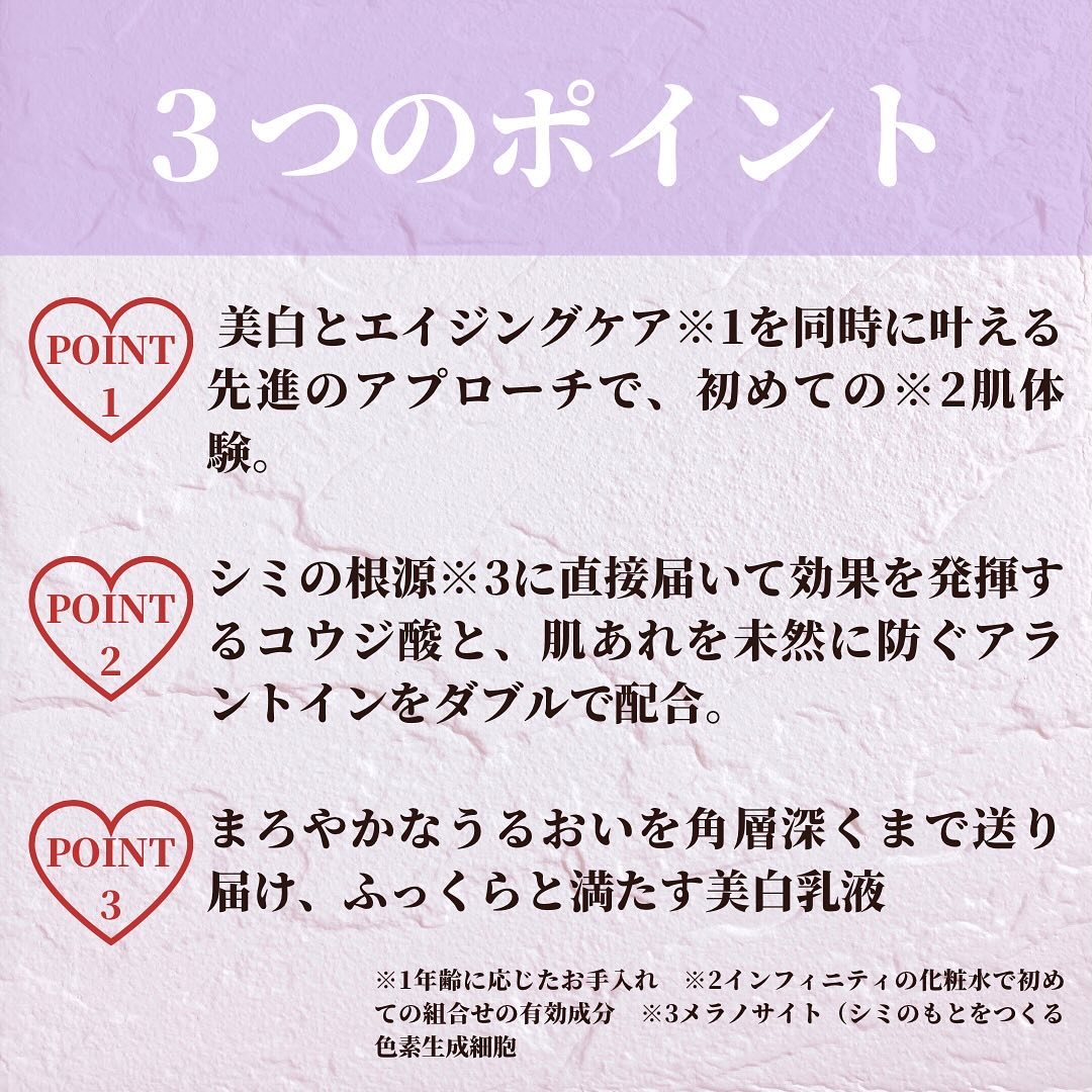 インフィニティ🍃イノベイティブブライトセラムXX柔らかいテクスチャーの美容液するする伸びますリニューアル発売浸透感が高く、角層深くまで有効成分を届ける。 パールのように輝く肌へみちびく薬用美白美容液。🟡美白とエイジングケア※1を同時に叶える先...