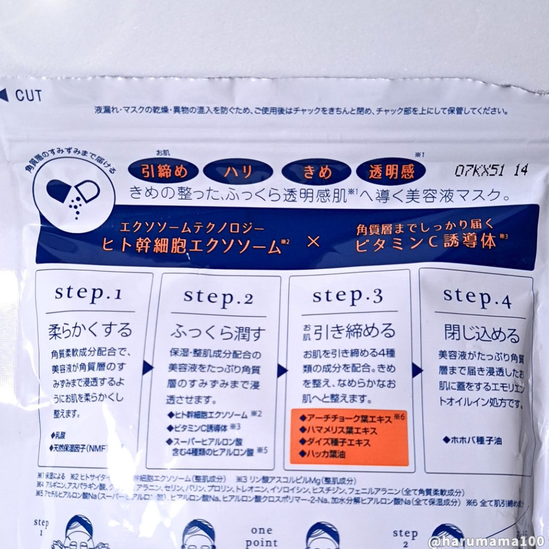 - ヒト幹細胞エクソソーム*1のシートマスク。ビタミンC誘導体*2も配合し、乾燥による毛穴ケアにおすすめです。天然コットンに液量がたっぷり浸透した贅沢シートマスクです。 *1ヒトサイタイ血由来幹細胞エクソソーム(整肌成分) *2整肌成分