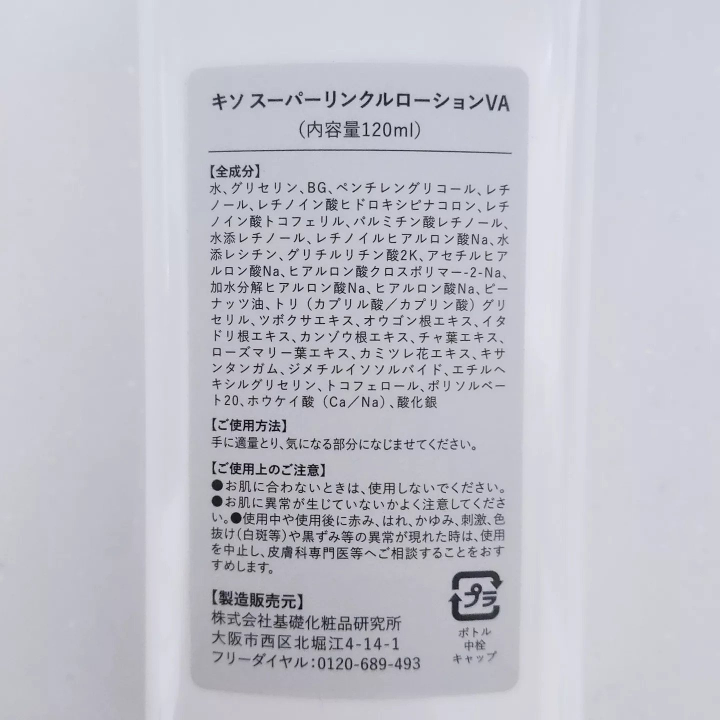 KISO スーパーリンクルローション VAはレチノール配合の化粧水。見た目に驚いたのを覚えています。だってかなりスリムなパッケージなんですもの。 肌にハリを与える・肌荒れを防ぐ・くすみを解消・若々しい弾力のある肌へ・キメの整った肌へ・透明感のある肌へといった年齢を感じる肌悩みに嬉しい成分であることには違いないから、上手くスキンケアに取り入れるのは賢い選択かも。 匂いがなく重さがないから、使いやすさもあり、レチノールによる刺激らしい刺激もなく普通に使えたので個人的には大丈夫でした。