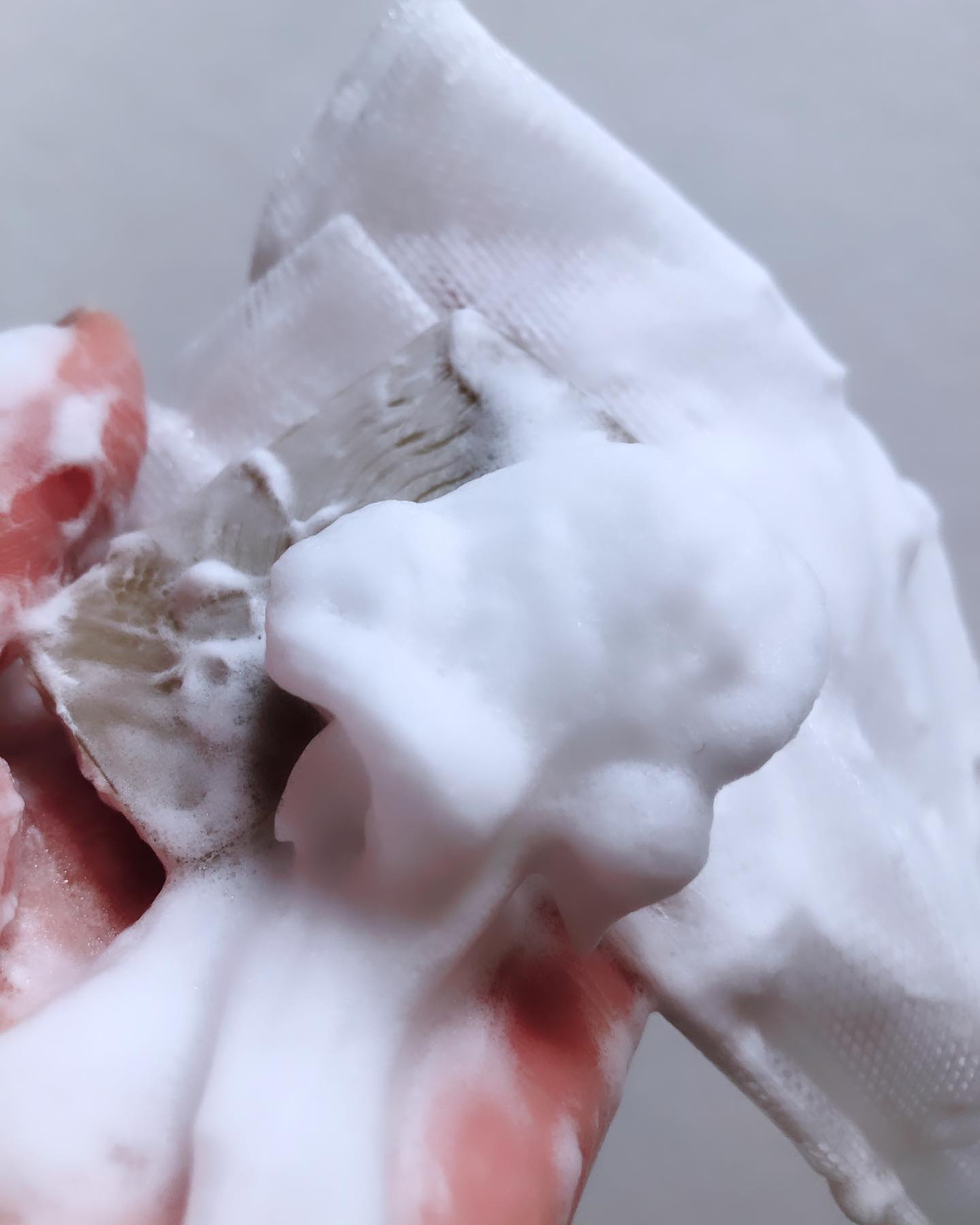 清らかな海洋深層水をはじめ、 キチンエキス 加水分解コラーゲン ハチミツ カワラヨモギ花エキス 「防腐剤、酸化防止剤、安定剤、着色剤、香料」 付属のネットで泡立ててみると、泡立ちが良く、濃密なもちもちした泡ができました。 刺激に弱い肌にふれずに洗える泡はありがたいなぁと思いました。 肌負担に繋がりにくい天然のものを選んで処方しているとのことで、 敏感肌や乾燥肌 アレルギー肌 ニキビ肌の方 きめ細やかに泡立つ植物無添加石けん、健やかな肌になることを期待して使わせていただきます♪