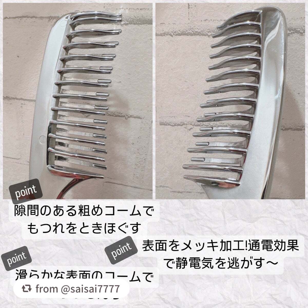 - 静電気からキューティクルを守ってまとまる髪に! 髪にたまったパチパチをクロムメッキが逃がします。 滑らかな表面のコームで髪通りするんっ。 隙間のある粗めコームがもつれをときほぐします。