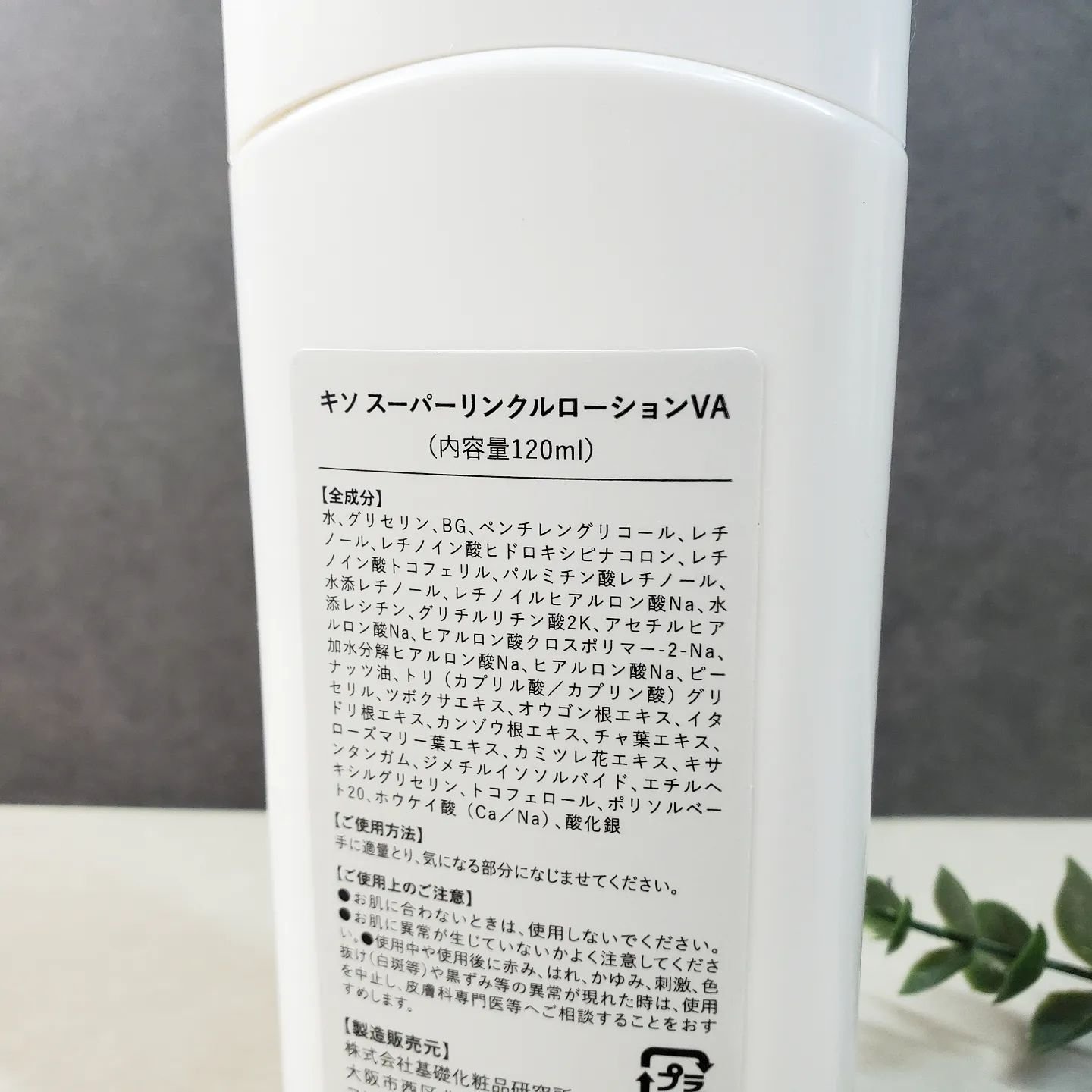 KISO スーパーリンクルローション VAはレチノール配合の化粧水。見た目に驚いたのを覚えています。だってかなりスリムなパッケージなんですもの。 肌にハリを与える・肌荒れを防ぐ・くすみを解消・若々しい弾力のある肌へ・キメの整った肌へ・透明感のある肌へといった年齢を感じる肌悩みに嬉しい成分であることには違いないから、上手くスキンケアに取り入れるのは賢い選択かも。 匂いがなく重さがないから、使いやすさもあり、レチノールによる刺激らしい刺激もなく普通に使えたので個人的には大丈夫でした。