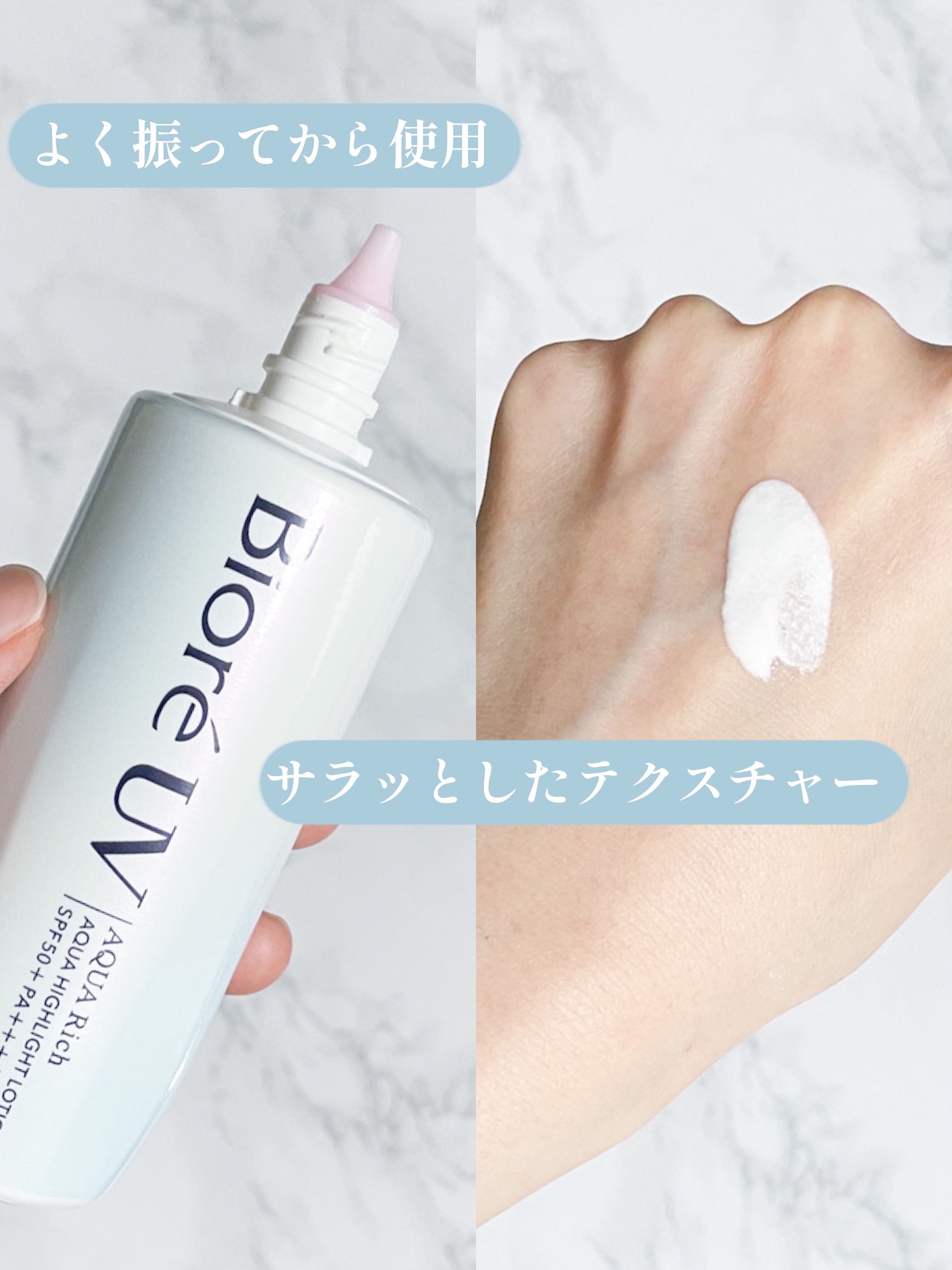 .ビオレUVアクアリッチアクアハイライトローション🌸#水層ハイライトuv身体用に購入🙌シャバシャバ系の日焼け止め。ジェルタイプに慣れてた私としてはやや使いづらい笑でも微粒のパールがすごくて、ほんとにキラキラつや感がアップ。頰、鼻筋やひたいに使...