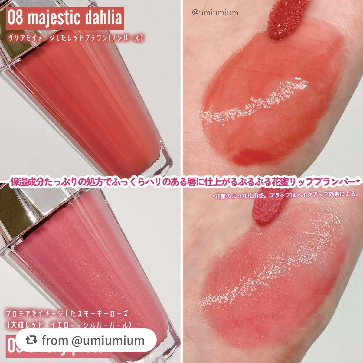 - ふっくらハリのある仕上がりで花束のように華やぐ。 自然由来指数90%※1で唇を優しく包む花蜜リッププランパー※2 ・心地よい清涼感とプランプ効果※3でふっくらハリのある唇に仕上がります。唇が温かさを感じる成分と、冷たさを感じるメントール誘導体を配合しました。高い保湿効果でたっぷりのうるおいをあたえるメルティングフィットオイル、唇を厚い膜で包み、ツヤをあたえて保護するクリスタルコーティング成分、さらに5種類の植物由来の保湿成分を配合。ふっくらぷるんと、ツヤの高い唇を演出します。 ・クリスタルブルームの香り ※1 自然由来指数90%(水を含まない)ISO 16128 準拠。 ※2花蜜のような使用感。プランプはメイクアップ効果による。※3 メイクアップ効果による。