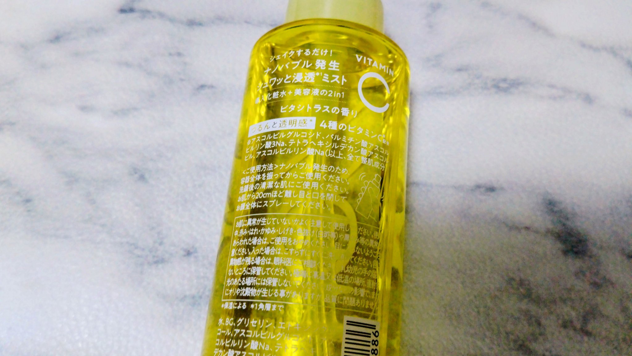 - 限定 2023/4/25より順次一部企業先行発売 シェイクするだけ! ナノバブル発生でシュワッと浸透 ミスト※1 超微細なミストがビュンッと浸透※1 して、つるんと透明感※2 のある肌へ! 導入化粧水+美容液の2in1 【4種のビタミンCを配合】 ・アスコルビルグルコシド ・パルミチン酸アスコルビルリン酸3Na ・テトラヘキシルデカン酸アスコルビル ・アスコルビルリン酸Na (以上、全て整肌成分) ビタシトラスの香り ※1 角層まで ※2 保湿による
