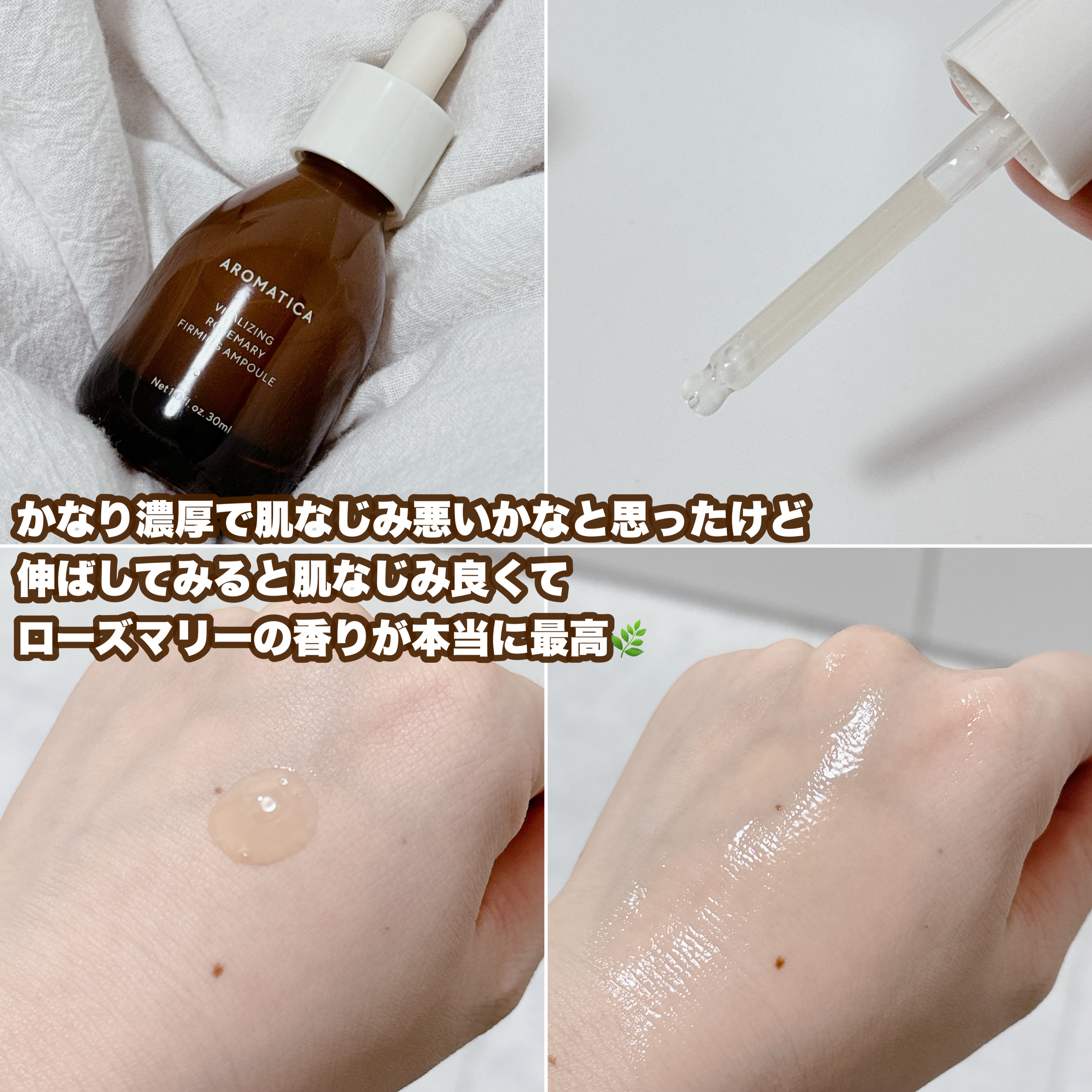 @aromatica.jp様より、ローズマリー弾力セラムをいただきました。使いやすいスポイトタイプ。みずみずしいテクスチャーのセラムです。すーっと伸び広がり、なじんでくれます。みずみずしい使用感で、肌なじみが良いです。アロマの良い香りと、爽や...