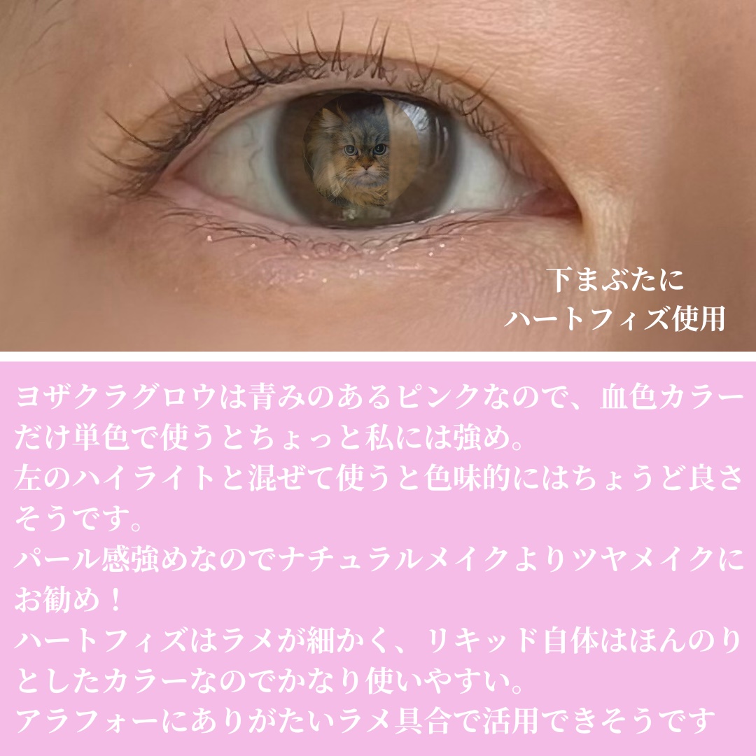 涙袋のちょい上?1番光が入る部分にラメライナー引くのにハマっててコスパ良過ぎて結局3色全部購入。 他社のラメライナーに比べて繊細で自然な大きさのラメ🫧 多色ラメで使いやすいクリスタルカラー。 どんなメイクにも合わせやすく、塗るだけで一気に目元が華やかになります💜 ダントツ1番使用頻度高いハートフィズ🩷 ピンクベージュ系、ピンク系のメイクと相性抜群。これ引くだけで一気に可愛らしいうるっと涙袋爆誕🥺