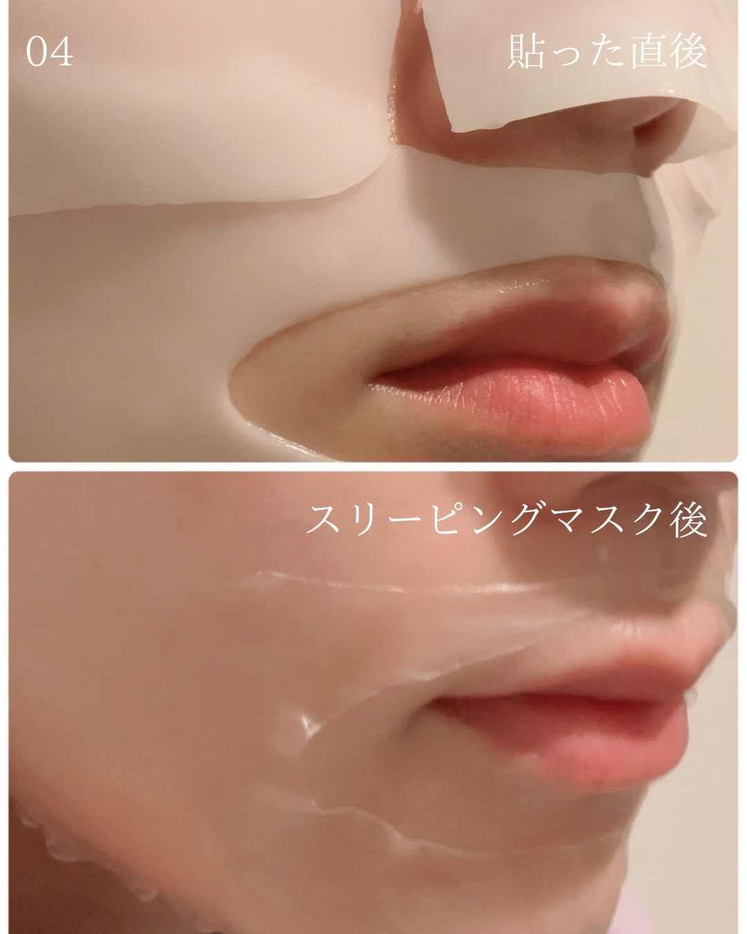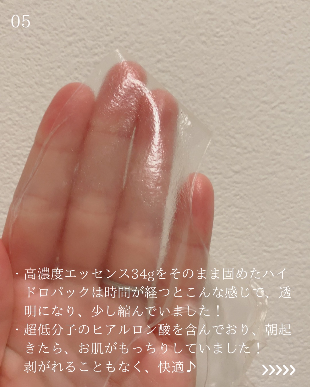 肌への摩擦を抑えたゲル加工のトナーパッド!初めて見たときはこの透明感あるパッドにびっくりしたよ😍凹凸面となめらか面があるけどぷるぷるでピッタピタに密着する✨ エッセンス34gを固めた話題のハイドロゲルパック✨シートがめっちゃぷるぷるの新感覚マスク!上下に分かれていて、下のシートから貼り付けるよ! 液だれやべたつきがなく、スリーピングマスクとしても使えるから、私は寝る前に貼って、朝外すことが多いよ!