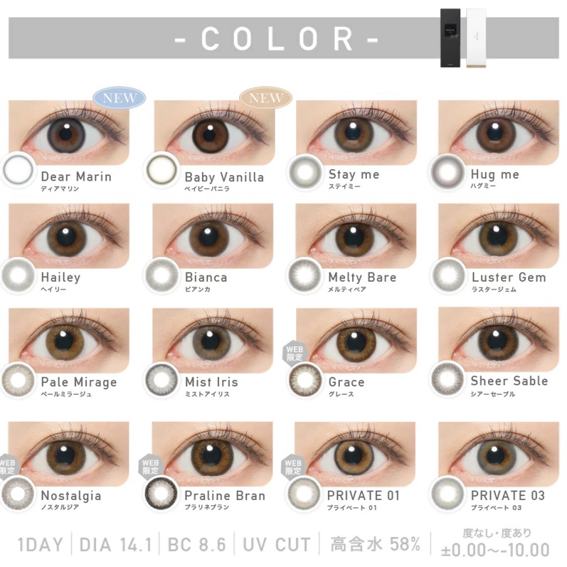 - 10~20代のイメージが強いカラーコンタクトレンズを一新し、幅広い年代の方に愛用頂ける事をコンセプトに掲げ誕生したレンズブランド。 レンズ直径14.1mmを採用し、自然な美しい瞳になれるようにデザインやイメージごとに着色直径を変えたレンズラインナップ。 度数(PWR):全30 度数 ±0.00,-0.50 -5.00(0.25step)、-5.50-10.00(0.50step) DIA14.1mm/BC8.6mm