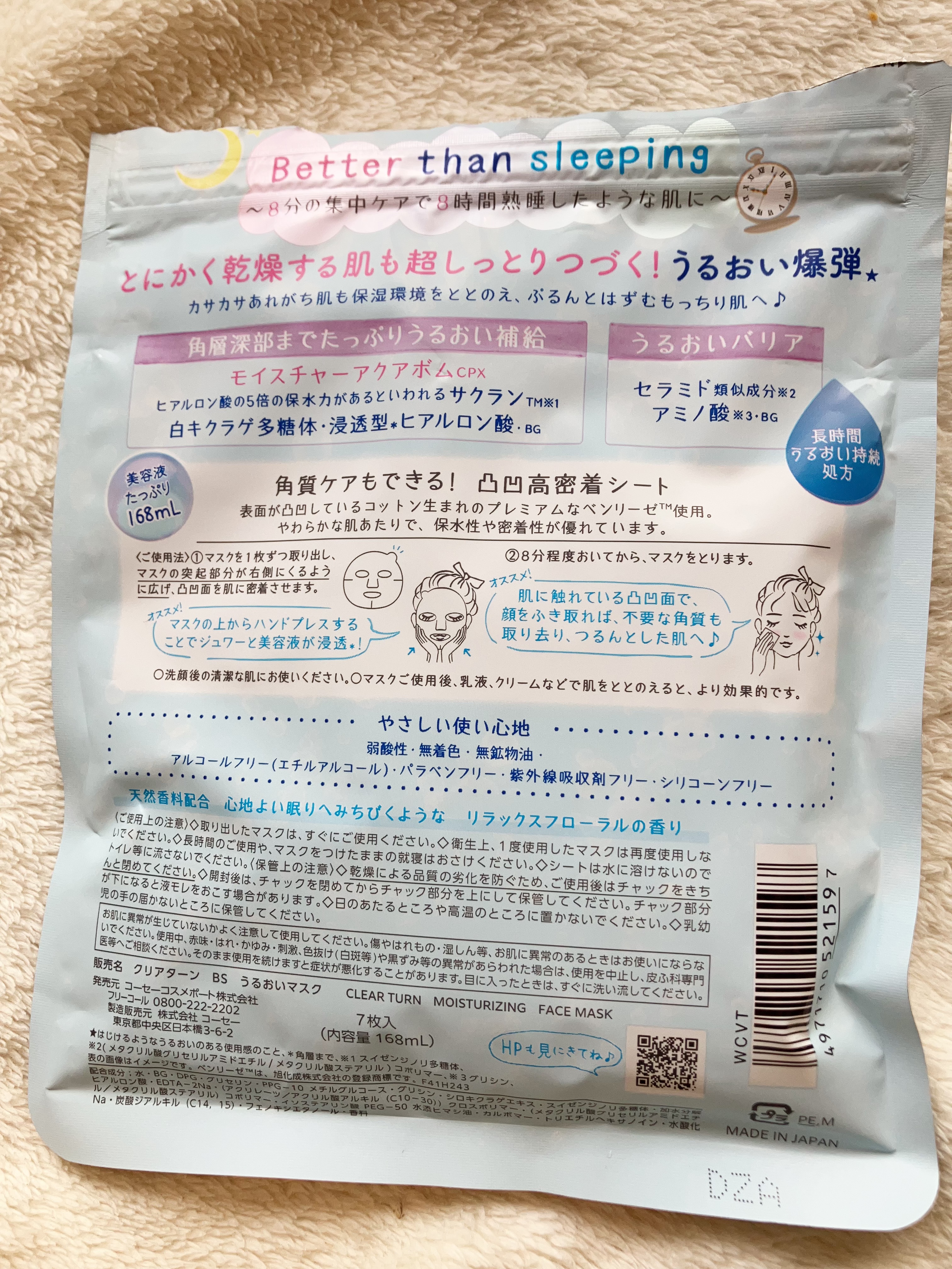 ♡クリアターンうるうるBOMB7枚入心地よい眠りへみちびくようなリラックスフローラルの香り。oOo。.:♥:.。oOo。.:♥:.。oOo。.:♥うるうるBOMB初めて使用してみました!香りもよくパックも広げやすく付けやすい☺️8分程度おくだ...