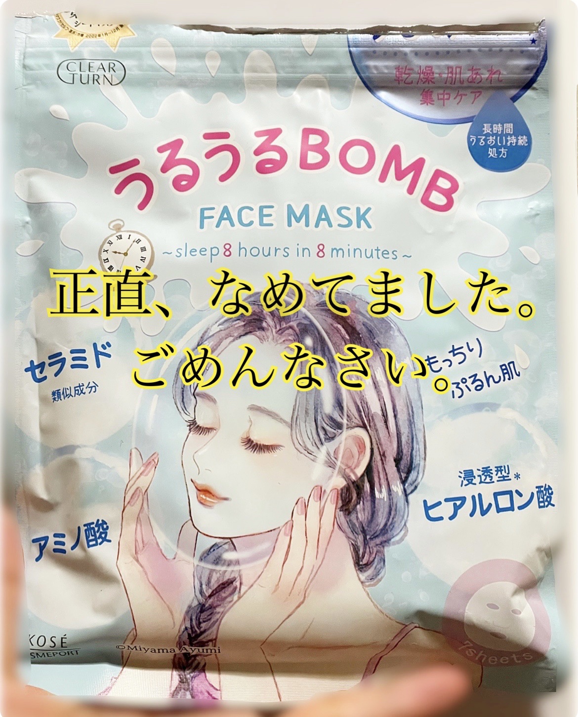 ジャケ買いしました。生地があんま好きじゃないけどマスクとしては多分優秀!【使った商品】クリアターンうるうるBOMBマスク¥660【商品の特徴】・高保湿タイプシートマスク・ヒト型セラミド配合・とにかく“うるうる”を前面に出した設計・スペシャルケ...