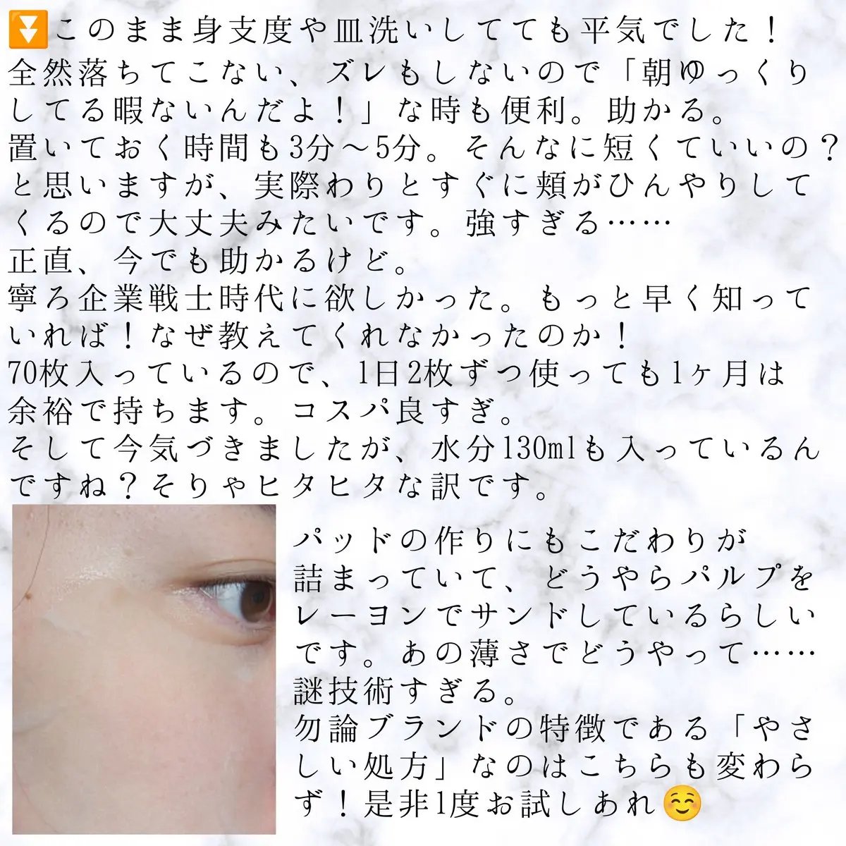 | 化粧水ランキング第86位 | コットンには毛穴の汚れや余分な油分がしっかりと付いていますが、肌はしっとりと潤っています。 | 詳細を見る | |