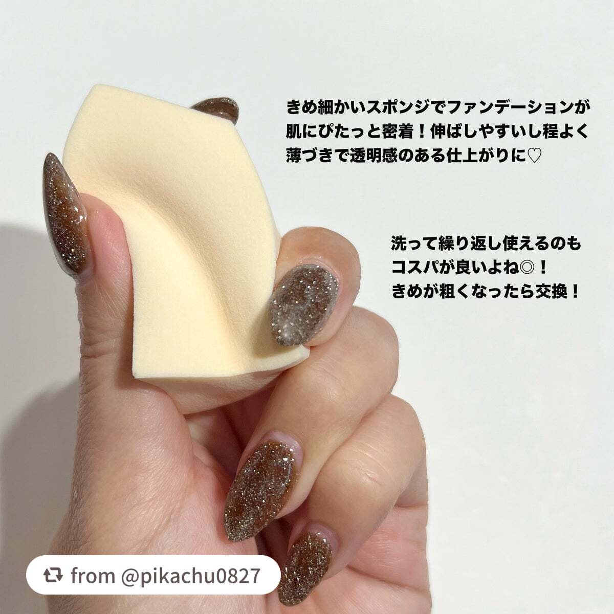 - 水でぷっくり膨らむスポンジ。透明感のあるツヤ肌仕上げ。キメの細かいスポンジで、ファンデーションがお肌にフィットし、ムラなくカバー。伸びが良く、程よく薄付きなので、透明感のあるツヤ肌に仕上がります。ぷるぷる感触が気持ちいい、ソフトな肌当たりの優しいスポンジです。2017年4月5日 パッケージをリニューアルして登場。