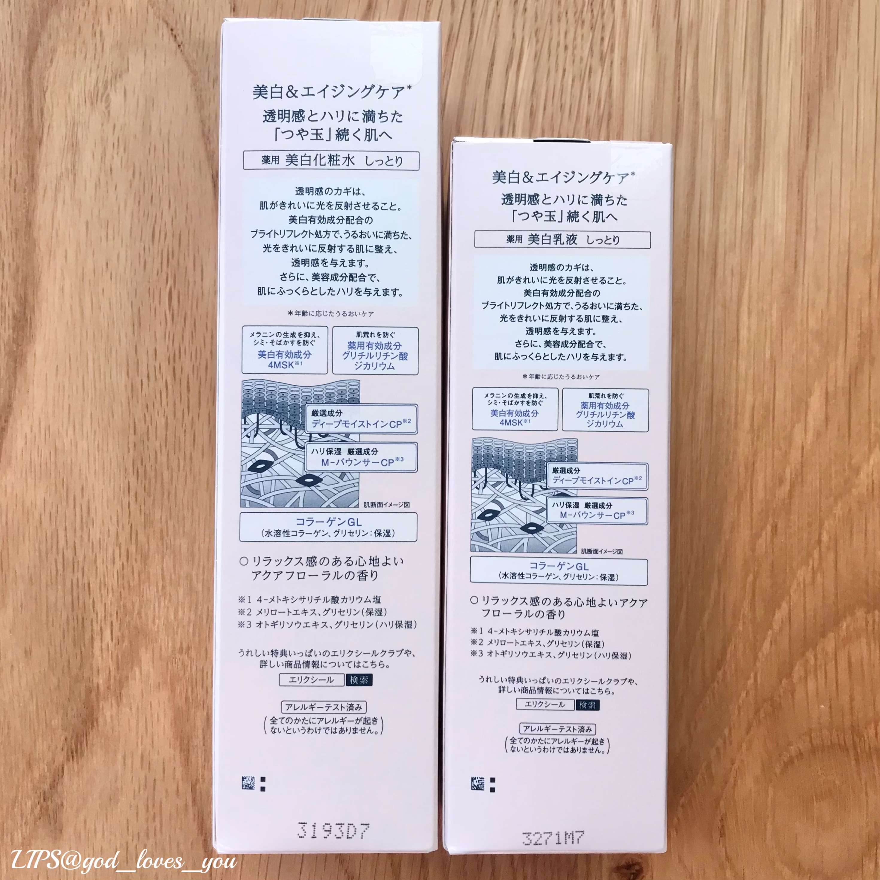 - ■商品特長 (医薬部外品) エリクシール 美白※3 &エイジングケア※2 世界初の光解析システム※4 の知見に着目。 透明感とハリに満ちた「つや玉」続く肌へ導く、薬用美白化粧水 ※2 エイジングケアとは、年齢に応じたうるおいケアです。 ※3 美白美白化粧品は、メラニンの生成を抑え、シミ・ソバカスを防ぎます。 ※4 肌からのすべての光を分離計測し、視覚的に詳細に解析できる技術が世界初である。クラリベイト社調べ(2022年9月) ○厳選された美容成分配合で、肌にハリを与えながら、浸透処方で角層深くまでうるおいを届けます。 ○透明感とハリに満ちた「つや玉」が輝き続ける肌へ導きます。 -美白有効成分 4MSK(4-メトキシサリチル酸カリウム塩)配合 -薬用有効成分 グリチルリチン酸ジカリウム(肌あれを防ぐ)配合 -厳選成分 ディープモイストインCP(メリロートエキス、グリセリン:保湿)配合 -コラーゲンGL(水溶性コラーゲン、グリセリン:保湿)配合 -厳選成分 M-バウンサーCP(オトギリソウエキス、グリセリン:ハリ保湿)配合 ○リラックス感のある心地よいアクアフローラルの香りです。 ○乾燥による小じわを目立たなくします。(効能評価試験済み) ○アレルギーテスト済み (全てのかたにアレルギーが起きないというわけではありません)。 ■テクスチャー(使用感) Ⅱ:なめらかにうるおう しっとりタイプ