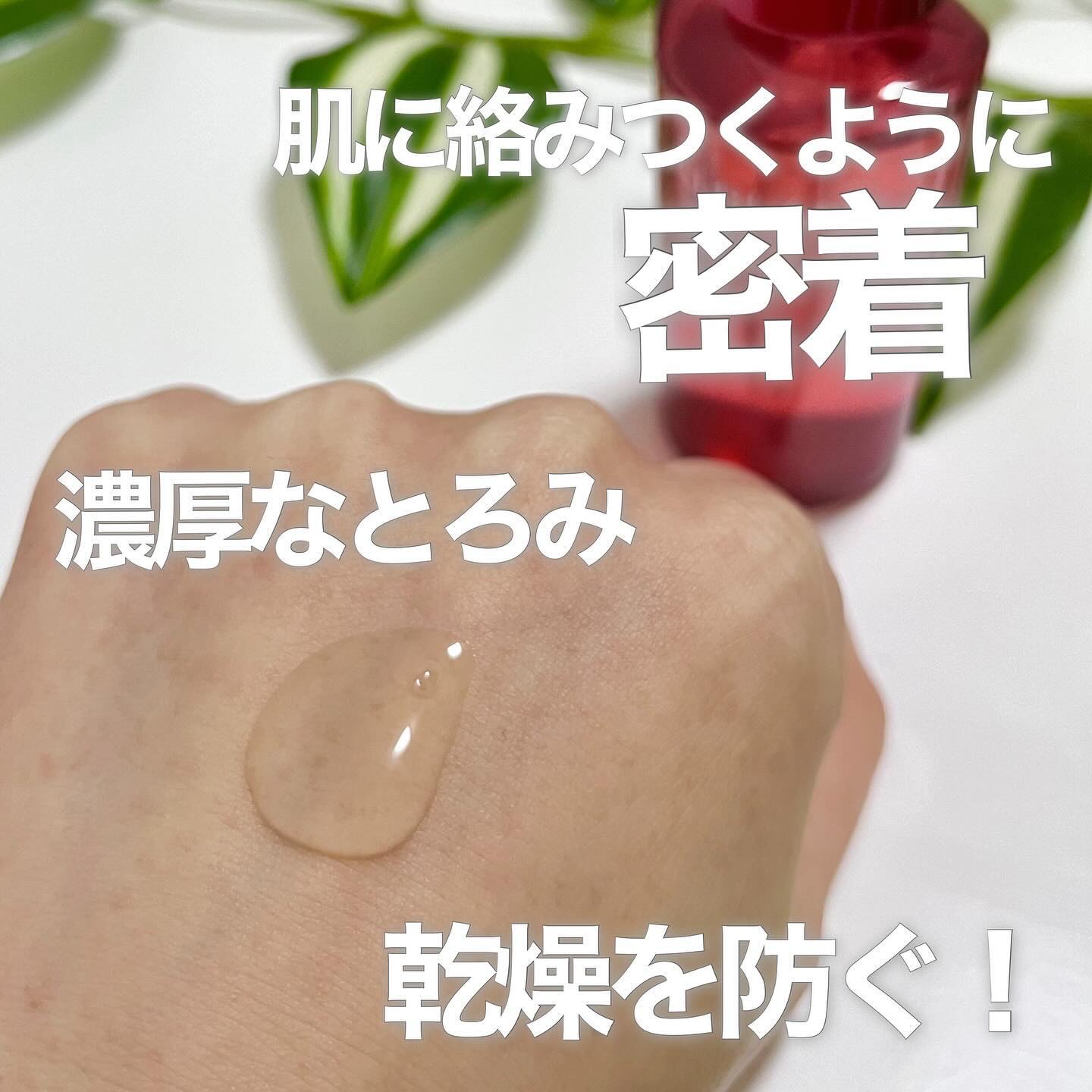 | 糸を引くくらい濃密で とろみのあるテクスチャー。 肌に膜がはったような密着感があり、 その後肌にすーっとなじんでベタつかない。 | 詳細を見る | |