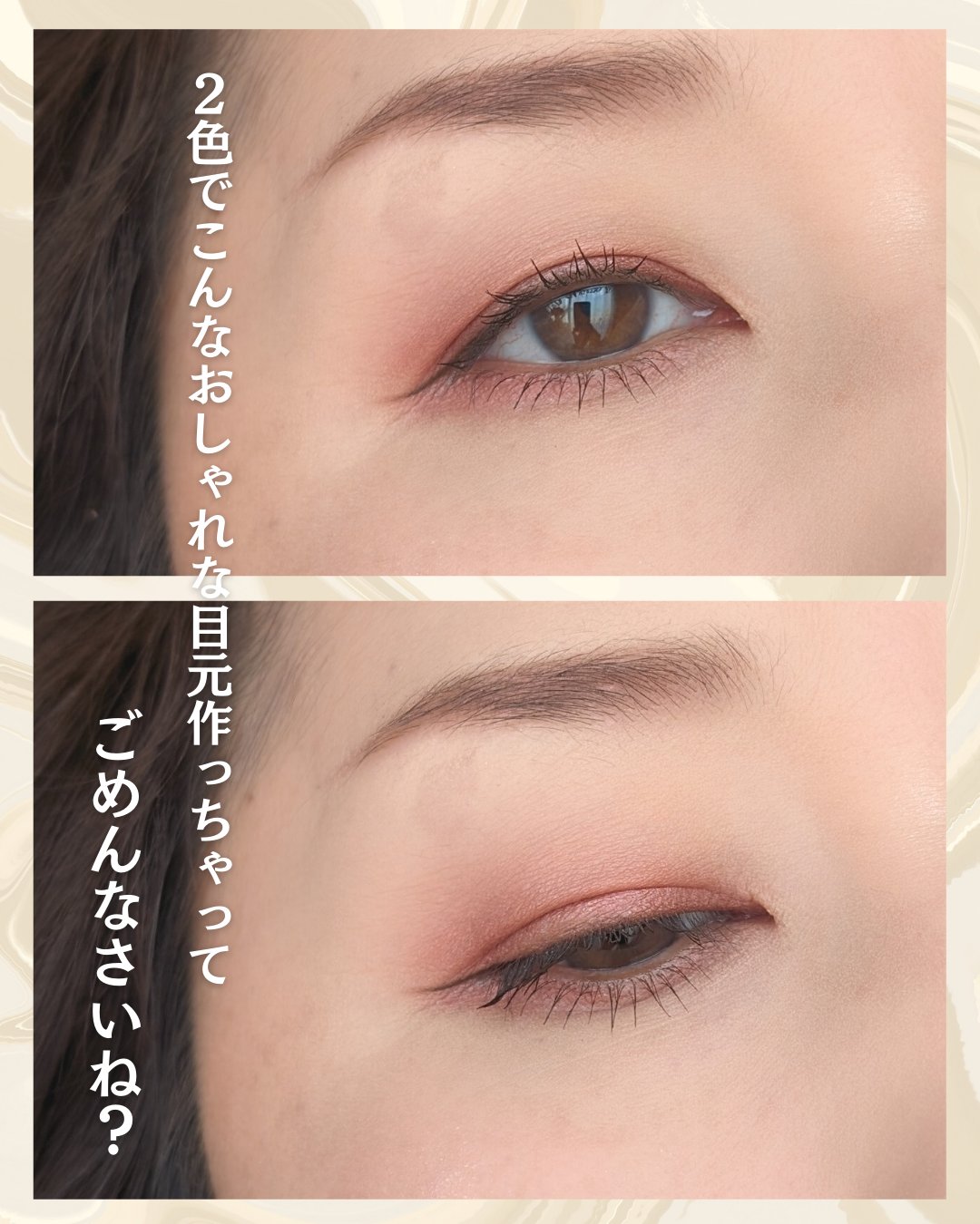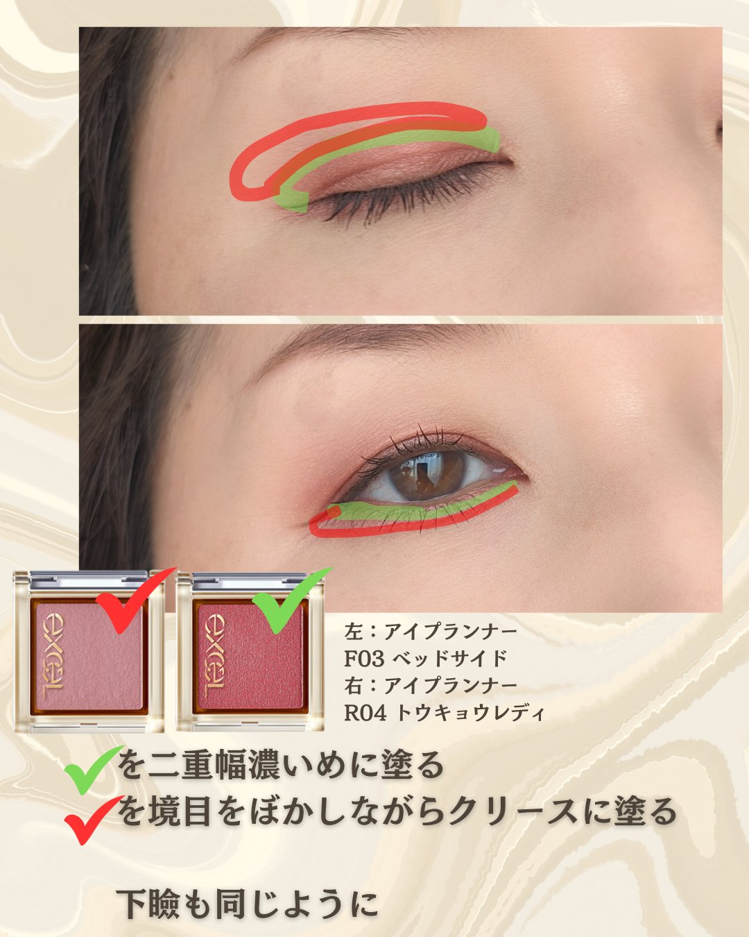 めっちゃぼかしながらまぶた全体にトウキョウレディ、目尻上下の際にタイニーキャット。 いまさらだけどタイニーキャットベースにしてトウキョウレディを差し色にした方がよかった気がする😂 他のアイテムもエクセル多めでした!