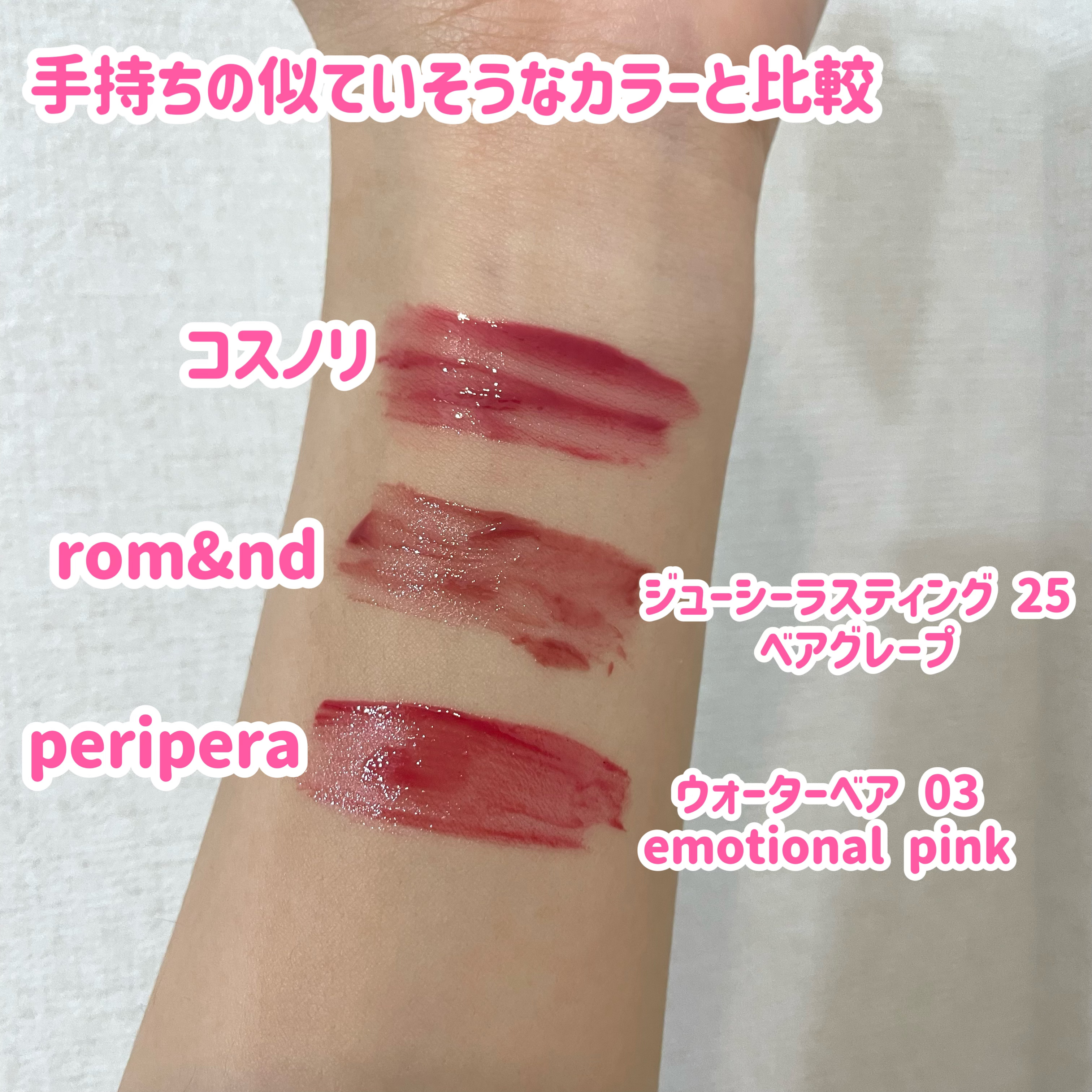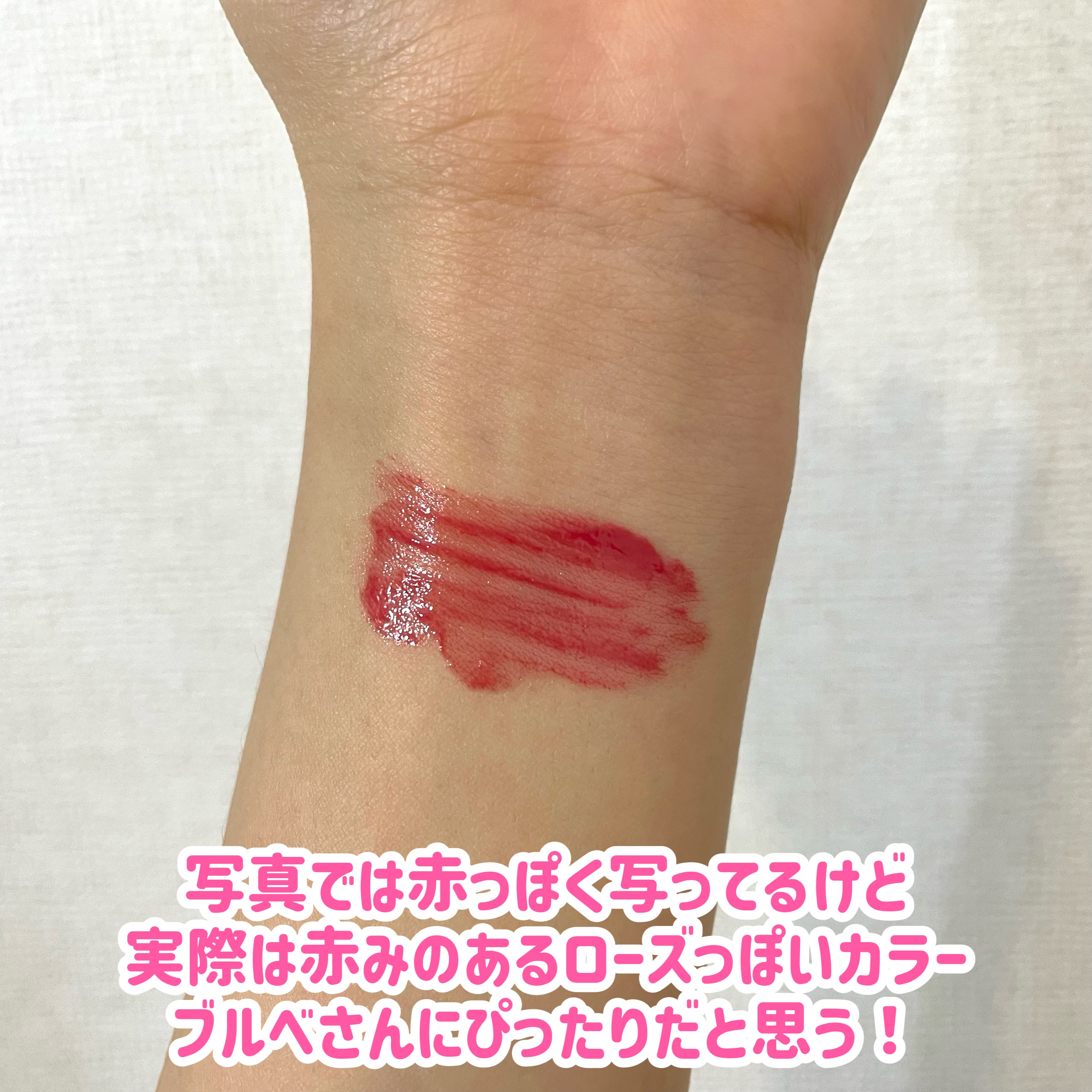 なんといっても付け心地の軽さが一番の魅力!(だと思ってる) 唇の中央に乗せて指でぽんぽん伸ばすと綺麗なグラデリップが作れてお気に入りだった!✨ ツヤはすぐなくなるけど、色持ちは結構良くて、2回くらい重ねて塗るといい感じ◎ ツヤ綺麗すぎるし、なによりもティント特有の濃くなる&赤くなる現象が起きにくい! 可愛いピンクが比較的長く続いてくれるから最高🥹 でもとにかく匂いが苦手、、、 仕上がりが本当に良すぎて匂いに負けじと使いまくってる🤣 これ初めて使ったときびっくりした! 色持ちが良すぎて🤣 がっつり塗るとかなり濃いめのピンクで、時間が経つとほぼ赤っぽいピンクになる。 ただ乾燥するのが難点。 ウォーターティントって名前なんだからよく考えたらわかりそうなものの、ペリペラの新作?!って飛び付いてメガ割で買ったよね🤣 特にインク ムード グロイ ティントは他のカラーも集めたいなあ🫶