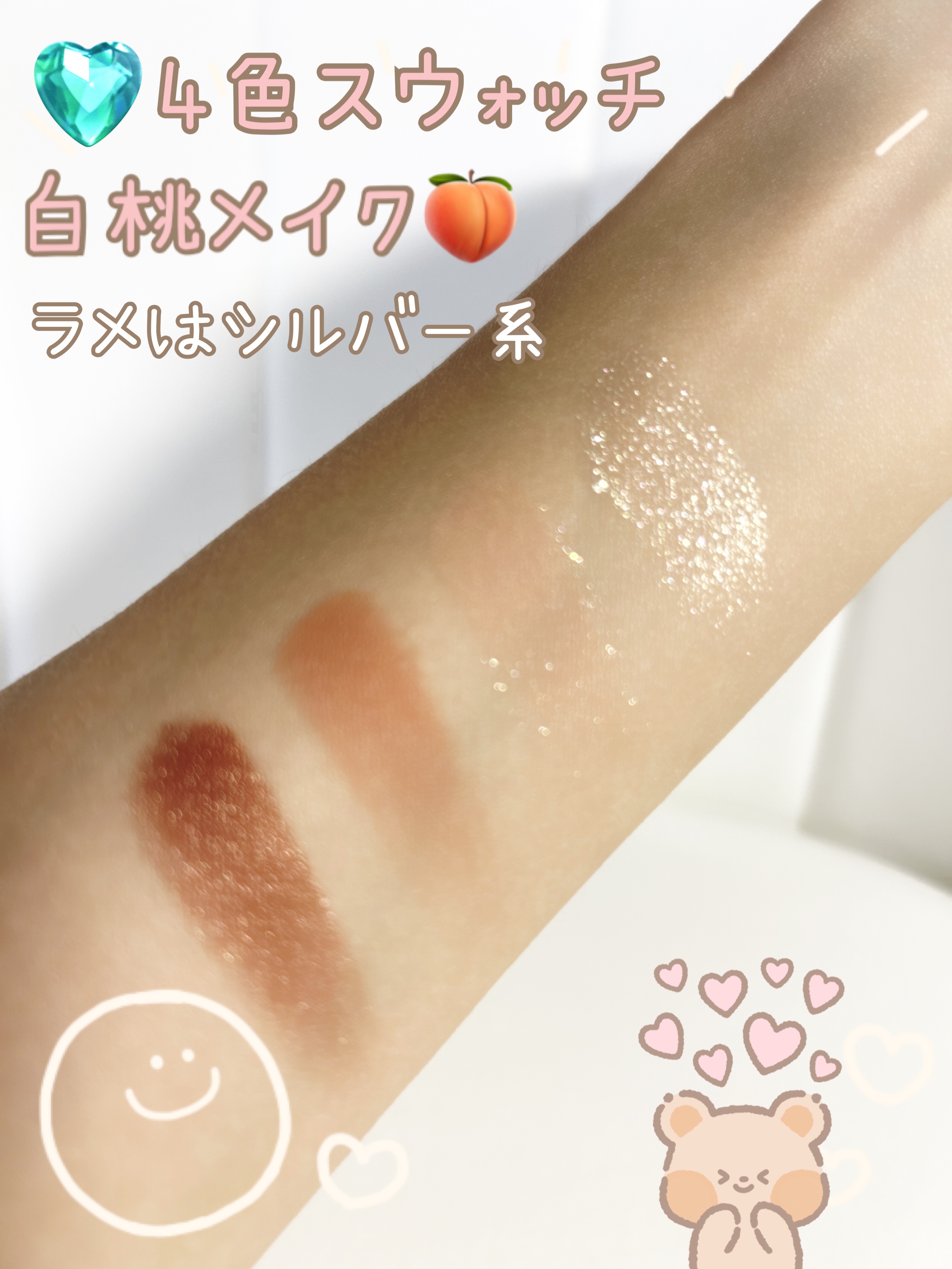 可愛い4色アイシャドウ✨ 落として②がひび割れました😂 見た目が③は黒にラメのシャドウかと思っていたのですが 塗って肌にのせると赤っぽい、ピンク紫?っぽい感じの色でした❣️ ポイントで涙袋キラキラするので涙袋に使用しても可愛い感じでした💕