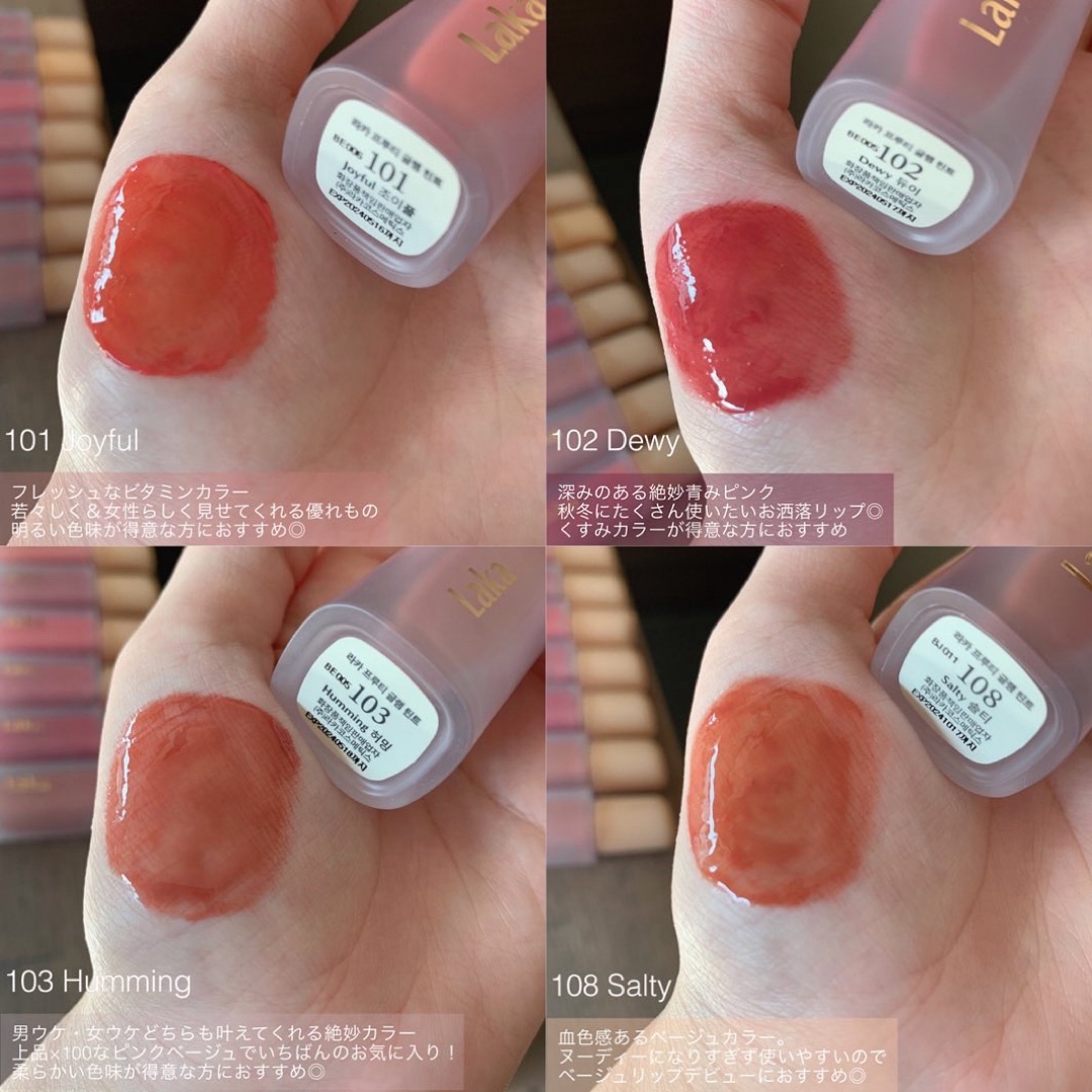 こちらのティントの良いところは PCに合いづらいカラーや苦手なカラーでも、シアーな発色なので使いやすいところ😉 オレンジ系やベージュ系のリップがあまり得意ではなく普段は購入しないのですが、ベージュ系108 Saltyとオレンジ系117 Zettaはよく使っております◎ そしてこの投稿を作っている最中にLIPSショッピングで追加購入した以前から気になっていたレッド系2色が届いたので近々そちらも比較レビュー予定🫶🏻 私が"全カラー集めたい!"とはじめて思った圧倒的おすすめリップ🍑最後の画像では実際に全色唇に塗って比較しているので、是非カラー選びの際の参考にしてください!