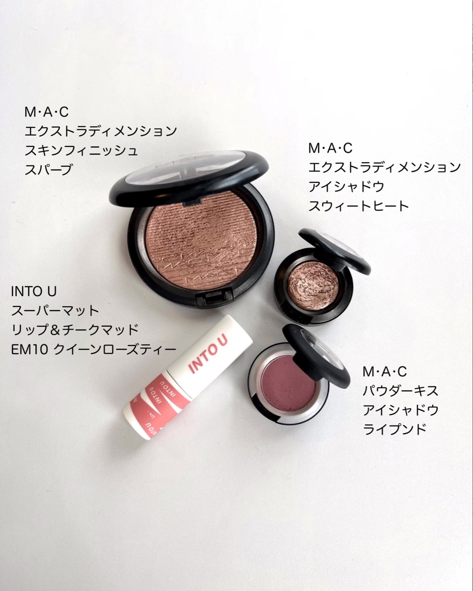 M・A・Cシングルアイシャドウの中でも推し推しの推したちを集めた最強デッキ❤️❤️ 大好きなMACの中から最推しを集めて迷わず盛れるメイクにしてみました😍💕 フィンファンはベースに優秀だし、ふんわりメイクが好きな方なら単色グラデもめちゃくちゃ可愛い🥰🥰 スウィートヒートはもう見ての通り(?)エクストラディメンション アイシャドウはツヤ感がほんっっとうに綺麗だから、組み合わせるとツヤツヤまぶたが作れるよ🥰