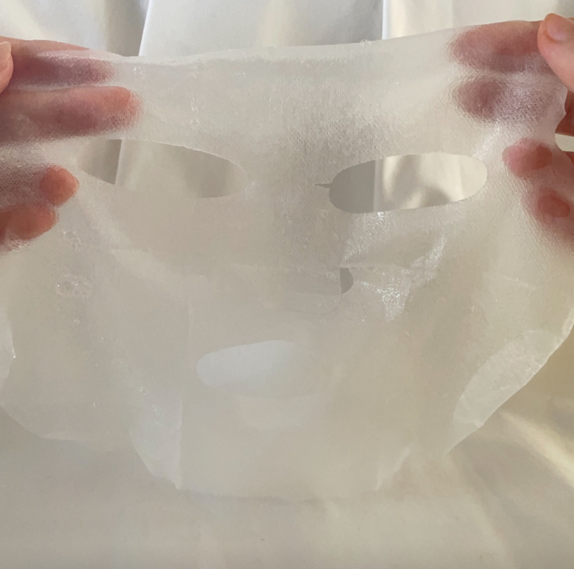 高純度グルタチオン*99%・高純度ビタミン C*98%配合のプレミアムアム グルタチオン*+ビタミンC*フォーミュラ 100%テンセル生地ˎˊ˗ 肌の色が透けるくらい薄手で 少しガーゼに似たようなやわらかい生地感💭 お風呂上がりに、導入美容液»化粧水の後 15分ほど置いて、はがすと 少し明るい印象の肌になったような キメが整った感じも👌🏻ˊ˗