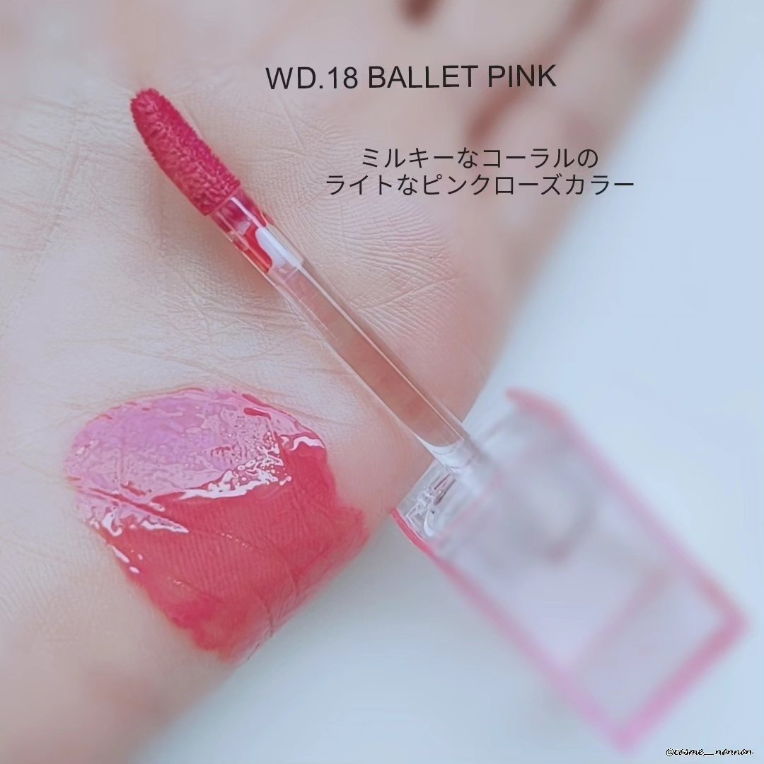 - <WD2 ビトゥン ローズ> 水、ジフェニルジメチコン、リンゴ酸ジイソステアリル、ビスジグリセリルポリアシルアジペート-2、水添ポリイソブテン、ジグリセリン、DPG、セチルPEG/PPG-10/1ジメチコン、イソステアリン酸ソルビタン、ポリソルベート60、ペンチレングリコール、オクチルドデカノール、セテアレス-20、(アクリル酸ヒドロキシエチル/アクリロイルジメチルタウリンNa)コポリマー、スクワラン、フェノキシエタノール、ポリグリセリン-3、ステビオシド、香料、エチルヘキシルグリセリン、グリセリン、シア脂、ツバキ種子油、トリ(カプリル酸/カプリン酸)グリセリル、アルガニアスピノサ核油、ホホバ種子油、アーモンド油、アンズ核油、月見草油、オリーブ果実油、テトラ(ジ-t-ブチルヒドロキシヒドロケイヒ酸)ペンタエリスリチル、カニナバラ果実エキス、マンゴー果実エキス、赤104(1)、赤227、黄5、青1 <WD3 ピンク ヘイズ> 水、ジフェニルジメチコン、リンゴ酸ジイソステアリル、ビスジグリセリルポリアシルアジペート-2、水添ポリイソブテン、ジグリセリン、DPG、セチルPEG/PPG-10/1ジメチコン、イソステアリン酸ソルビタン、ポリソルベート60、ペンチレングリコール、オクチルドデカノール、セテアレス-20、(アクリル酸ヒドロキシエチル/アクリロイルジメチルタウリンNa)コポリマー、スクワラン、フェノキシエタノール、ポリグリセリン-3、ステビオシド、香料、エチルヘキシルグリセリン、グリセリン、水酸化Al、ポリアクリル酸アンモニウム、BG、アルガニアスピノサ核油、シア脂、ツバキ種子油、トリ(カプリル酸/カプリン酸)グリセリル、アーモンド油、アンズ核油、ホホバ種子油、月見草油、オリーブ果実油、テトラ(ジ-t-ブチルヒドロキシヒドロケイヒ酸)ペンタエリスリチル、マンゴー果実エキス、カニナバラ果実エキス、酸化チタン、赤104(1)、赤227、黄5、青1 <WD4 オールウェイズ ヤング> 水、ジフェニルジメチコン、リンゴ酸ジイソステアリル、ビスジグリセリルポリアシルアジペート-2、水添ポリイソブテン、ジグリセリン、DPG、セチルPEG/PPG-10/1ジメチコン、イソステアリン酸ソルビタン、ポリソルベート60、ペンチレングリコール、オクチルドデカノール、セテアレス-20、(アクリル酸ヒドロキシエチル/アクリロイルジメチルタウリンNa)コポリマー、スクワラン、フェノキシエタノール、ポリグリセリン-3、ステビオシド、香料、エチルヘキシルグリセリン、グリセリン、シア脂、ツバキ種子油、トリ(カプリル酸/カプリン酸)グリセリル、アルガニアスピノサ核油、ホホバ種子油、アーモンド油、アンズ核油、月見草油、オリーブ果実油、テトラ(ジ-t-ブチルヒドロキシヒドロケイヒ酸)ペンタエリスリチル、カニナバラ果実エキス、マンゴー果実エキス、赤104(1)、赤227、黄5、青1 <WD6 クラッシュド パンプキン> 水、水添ポリイソブテン、リンゴ酸ジイソステアリル、ビスジグリセリルポリアシルアジペート-2、ジフェニルシロキシフェニルトリメチコン、ジフェニルジメチコン、ポリグリセリン-3、オクチルドデカノール、ポリソルベート60、セチルPEG/PPG-10/1ジメチコン、ラウリン酸ポリグリセリル-10、ペンチレングリコール、1,2-ヘキサンジオール、(アクリル酸ヒドロキシエチル/アクリロイルジメチルタウリンNa)コポリマー、PEG-60水添ヒマシ油、セテアリルアルコール、スクワラン、キシリトール、エチルヘキシルグリセリン、香料、ポリアクリル酸アンモニウム、イソステアリン酸ソルビタン、水酸化Al、フェノキシエタノール、BG、トコフェロール、酸化チタン、酸化鉄、赤227、黄4、黄5、青1 <WD8 ビンテージ カラント> 水、水添ポリイソブテン、リンゴ酸ジイソステアリル、ビスジグリセリルポリアシルアジペート-2、ジフェニルシロキシフェニルトリメチコン、ジフェニルジメチコン、オクチルドデカノール、ポリグリセリン-3、ポリソルベート60、セチルPEG/PPG-10/1ジメチコン、ラウリン酸ポリグリセリル-10、1,2-ヘキサンジオール、ペンチレングリコール、(アクリル酸ヒドロキシエチル/アクリロイルジメチルタウリンNa)コポリマー、PEG-60水添ヒマシ油、セテアリルアルコール、スクワラン、キシリトール、エチルヘキシルグリセリン、香料、イソステアリン酸ソルビタン、トコフェロール、赤104(1)、赤227、黄5、青1 <WD9 ミスター ストレンジャー> 水、水添ポリイソブテン、リンゴ酸ジイソステアリル、ビスジグリセリルポリアシルアジペート-2、ジフェニルシロキシフェニルトリメチコン、ジフェニルジメチコン、オクチルドデカノール、ポリグリセリン-3、ポリソルベート60、セチルPEG/PPG-10/1ジメチコン、ラウリン酸ポリグリセリル-10、1,2-ヘキサンジオール、ペンチレングリコール、(アクリル酸ヒドロキシエチル/アクリロイルジメチルタウリンNa)コポリマー、セテアリルアルコール、PEG-60水添ヒマシ油、スクワラン、キシリトール、エチルヘキシルグリセリン、香料、イソステアリン酸ソルビタン、水酸化Al、ポ